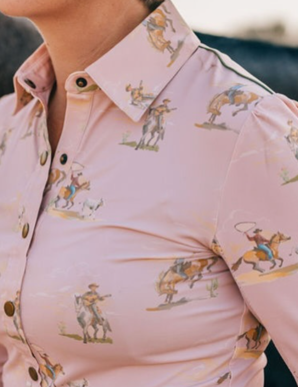 Our Vaquera Sunshirt features a classic button-down design with our personal twist: a pullover style with three beautiful brass-colored snap buttons at the top to prevent gaping. This sunshirt is a true staple for both streetwear and everyday riding, helping you look well put together and classic at any time!