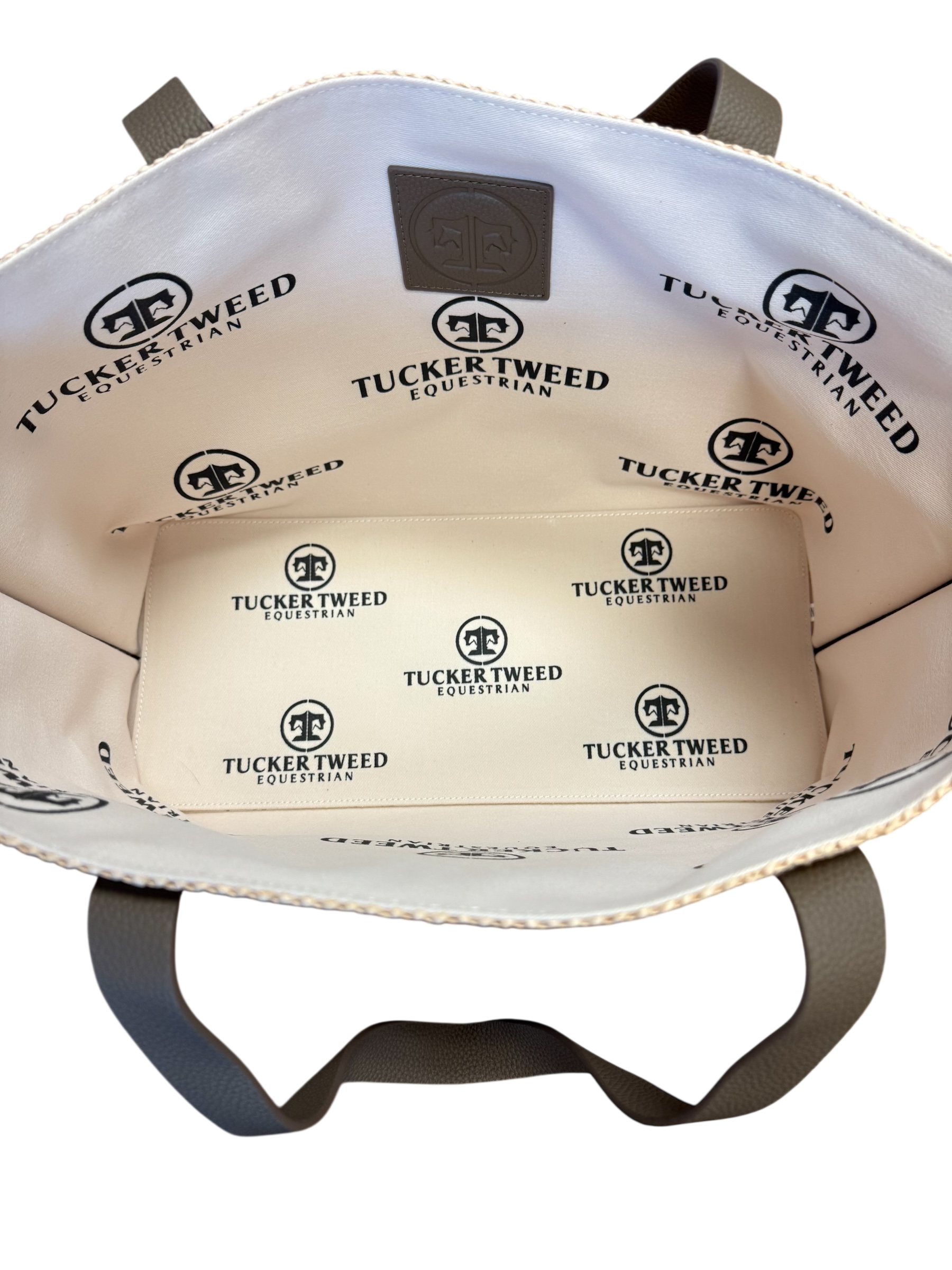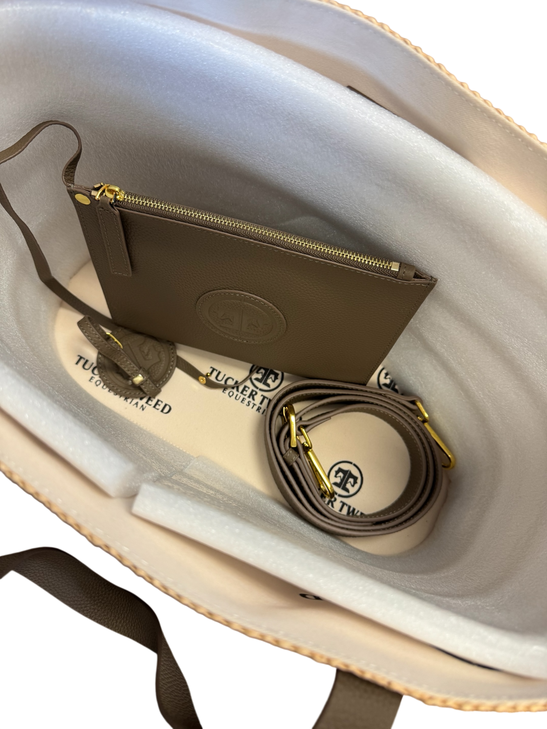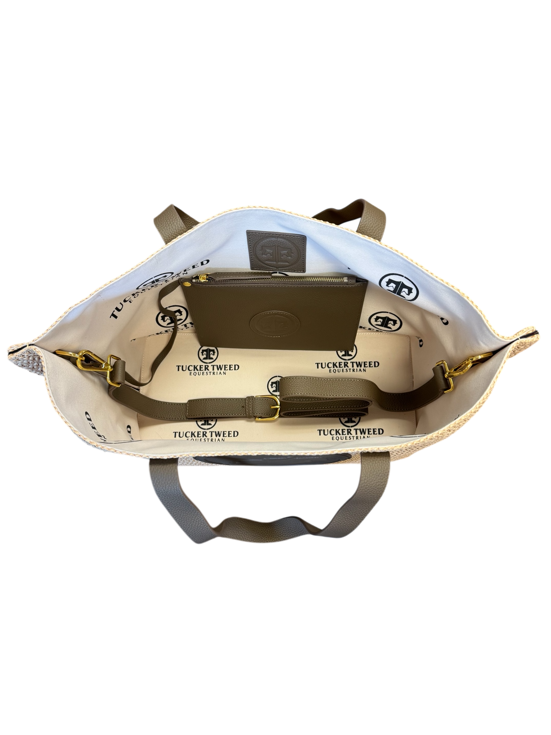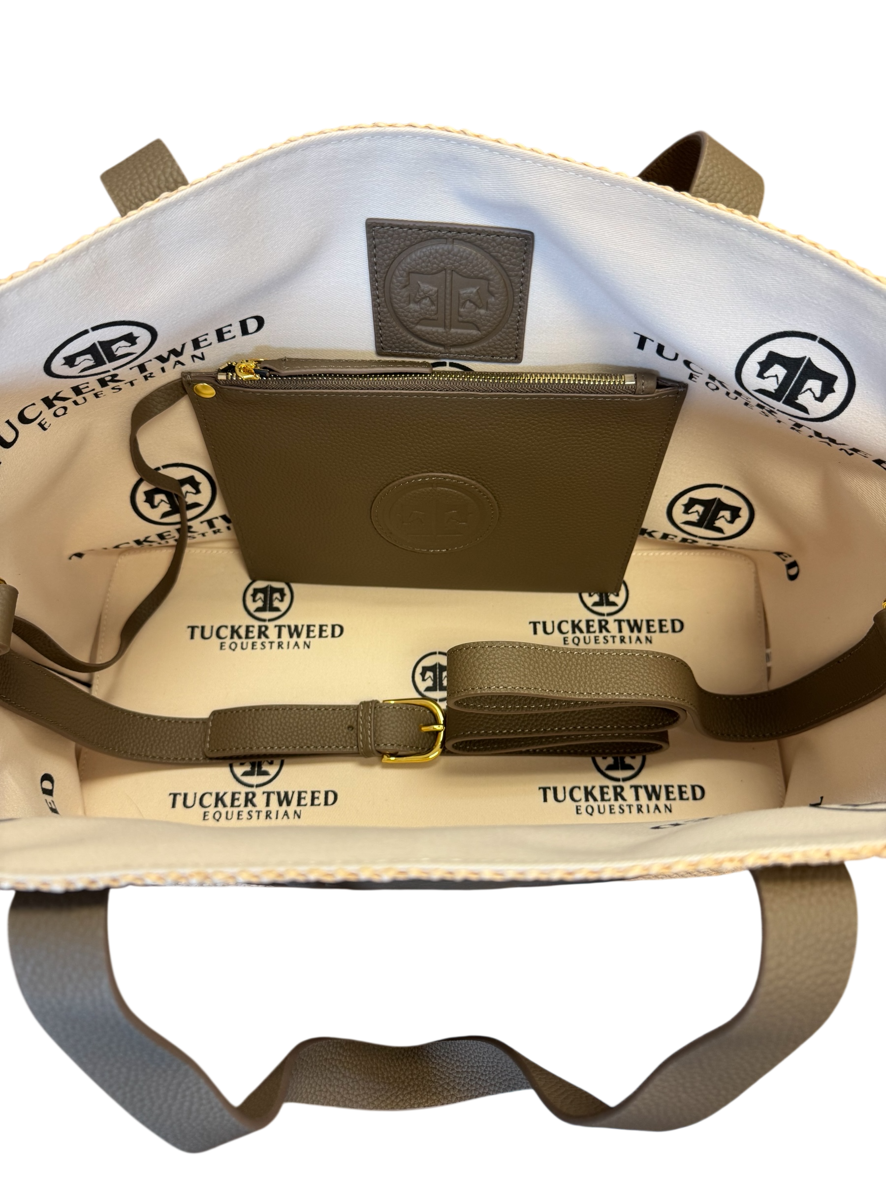 Elevated and versatile, our new raffia Barn to Beach Tote marries natural texture with refined, equestrian-inspired detailing. Handwoven with durable raffia and accented with stone-toned leather, this new style brings a touch of understated luxury to your everyday or getaway carry. Equipped with an optional shoulder strap, fully lined interior and an attached leather clutch for small essentials or carrying solo, this spacious and structured tote is the ideal companion from country to coast.