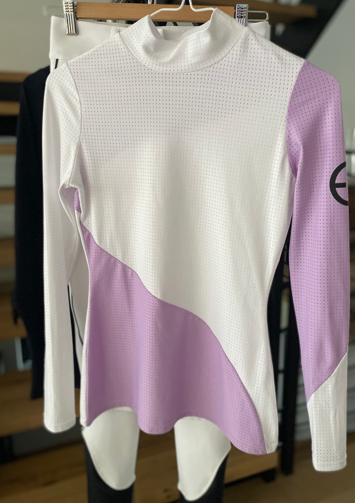 Our BELLA turtleneq was created for the rider to look sophisticated, professional and EQchic. Beige and black combination looks simple yet elegant at the same time fulfilling all the equestrian’s needs: comfort, sun protection, perfect fit with sweat wicking material. white/lilac perforated design is super light and airy and perfect as a show shirt.