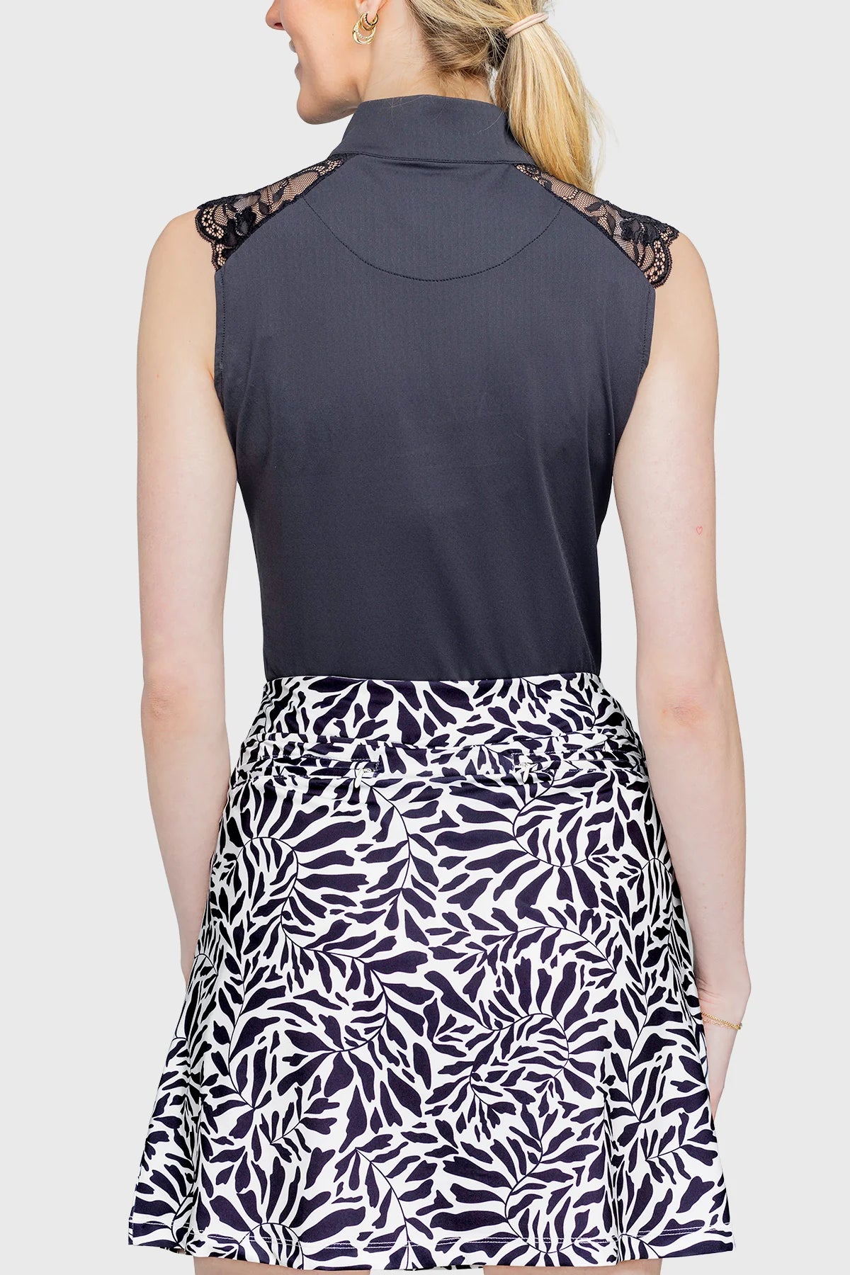 This season our elevated, black ¼ zip tank features soft, stretchy, feminine lace insets at the shoulders. UPF 30, (apply sunscreen under the lace) ¼ zip, soft 4-way stretch fabric in a contemporary fit
