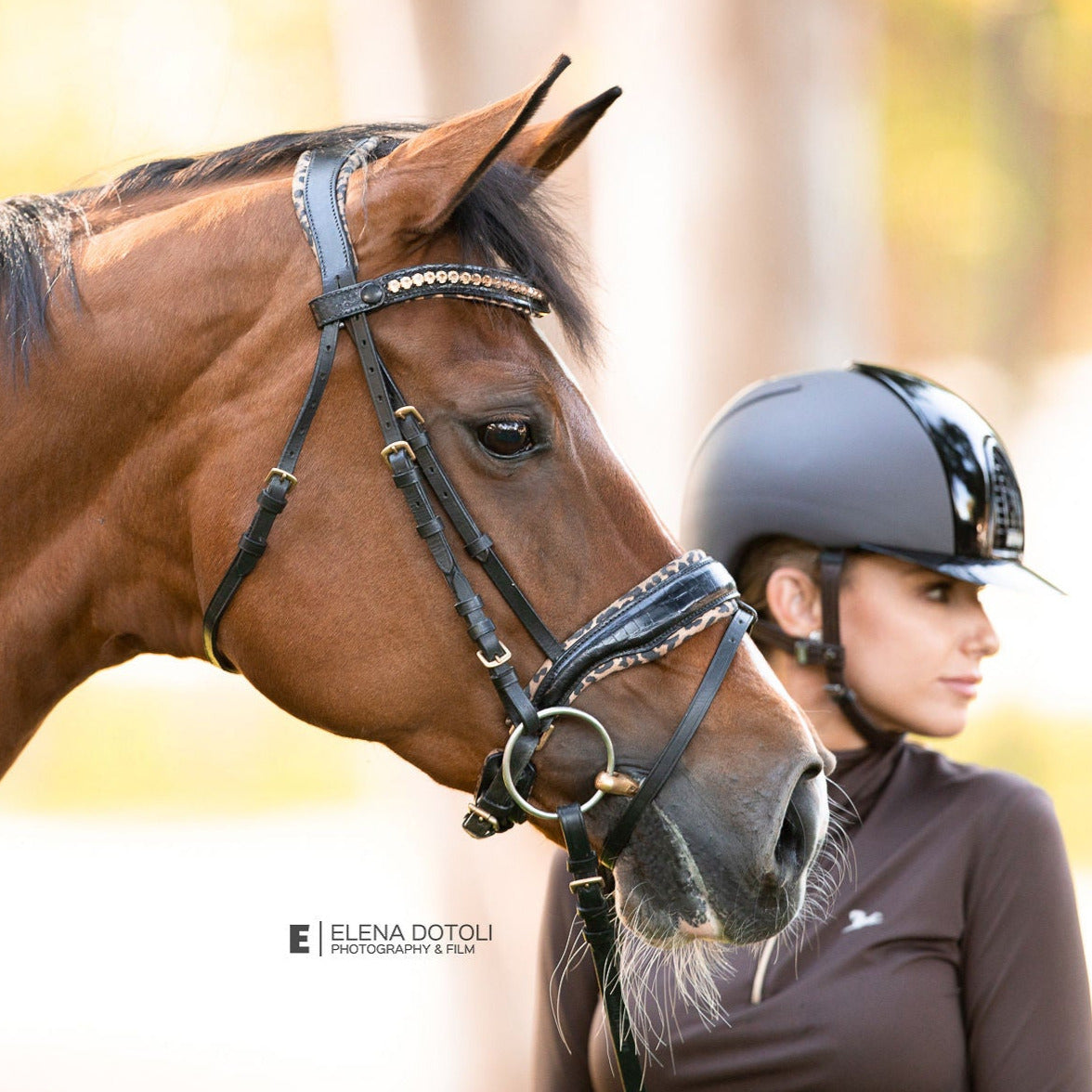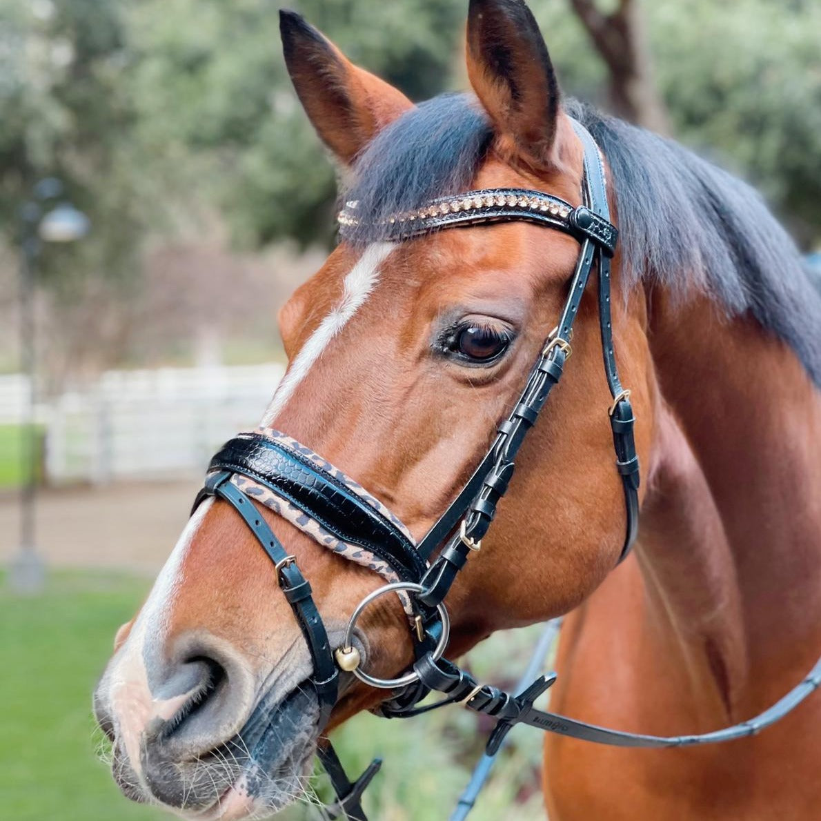 Bridle comes with a light golden single color Crystal browband in black patent croc print leather and leopard print padding to match rest of bridle.
