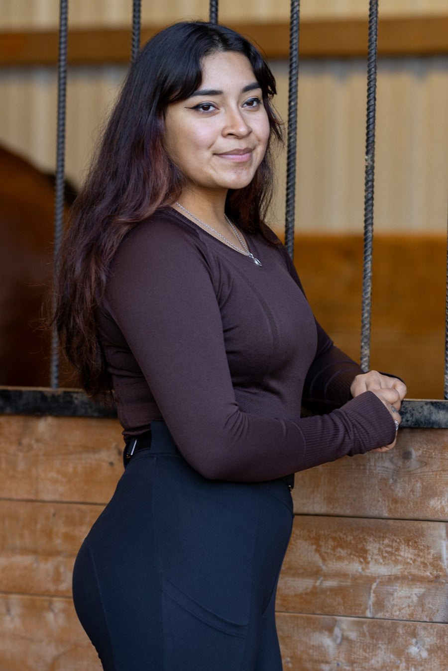 Our full stretch seamless top moves with you during barn chores and in the saddle. UPF 30+ sun protection when worn alone as a sunshirt, and silky close fit for wearing under layers. Thumbhole option, plus reflective B logo on back of neck.