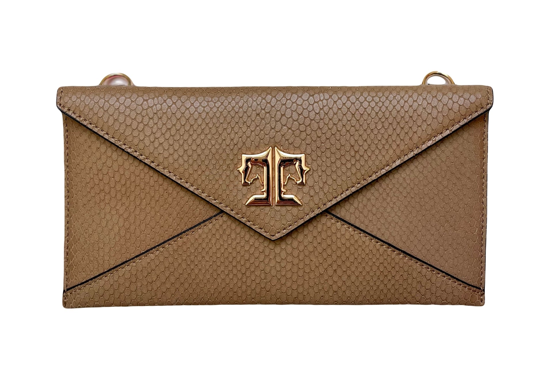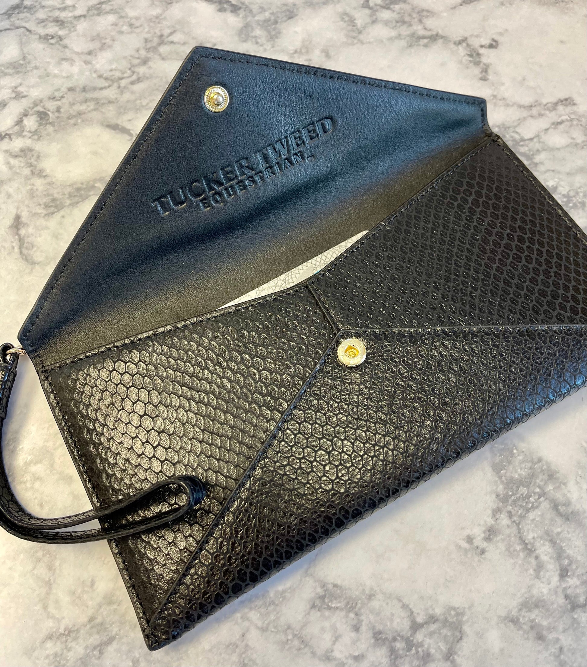 From ringside to date night, and everything in between—introducing the Cor De Star Clutch. Finished in leather-embossed exotic skins, including ostrich and snake, this equestrian cocktail clutch elevates your style to new heights. Featuring gold or gun metal signature logo, supple leather interior with 3 credit card slots, and a private zip pocket on exterior. Optional mini-curb chain shoulder strap and wristlet included. Next-level equestrian style for your next special occasion.