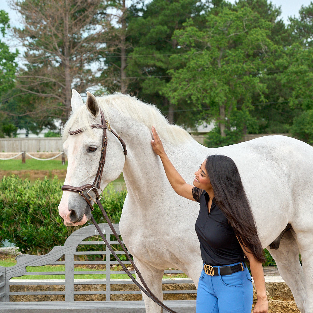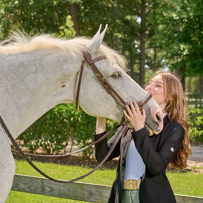 The Deauville anatomical jumper bridle features espresso brown leather, with white accent stitching creating a subtle, classic and chic design. The supple, buttery soft, vegetable tanned Italian leather, and an anatomically shaped noseband that alleviates pressure on your horses nose and face and provide maximum comfort for your horse.