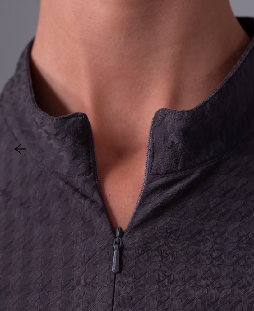 Long-sleeved competition shirt made from a technical intarsia fabric with a breathable houndstooth pattern, offering maximum freedom of movement. The rounded stand-up collar can be tied with a bow in the same fabric, adding an extra stylish detail. The shirt features long sleeves and fastens with a zipper at the front.