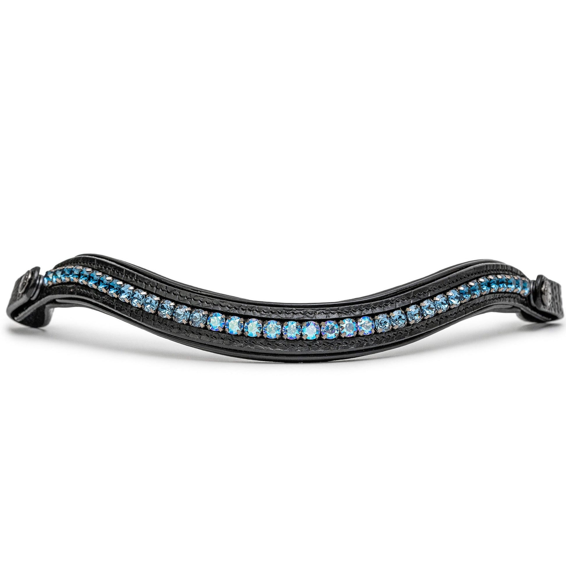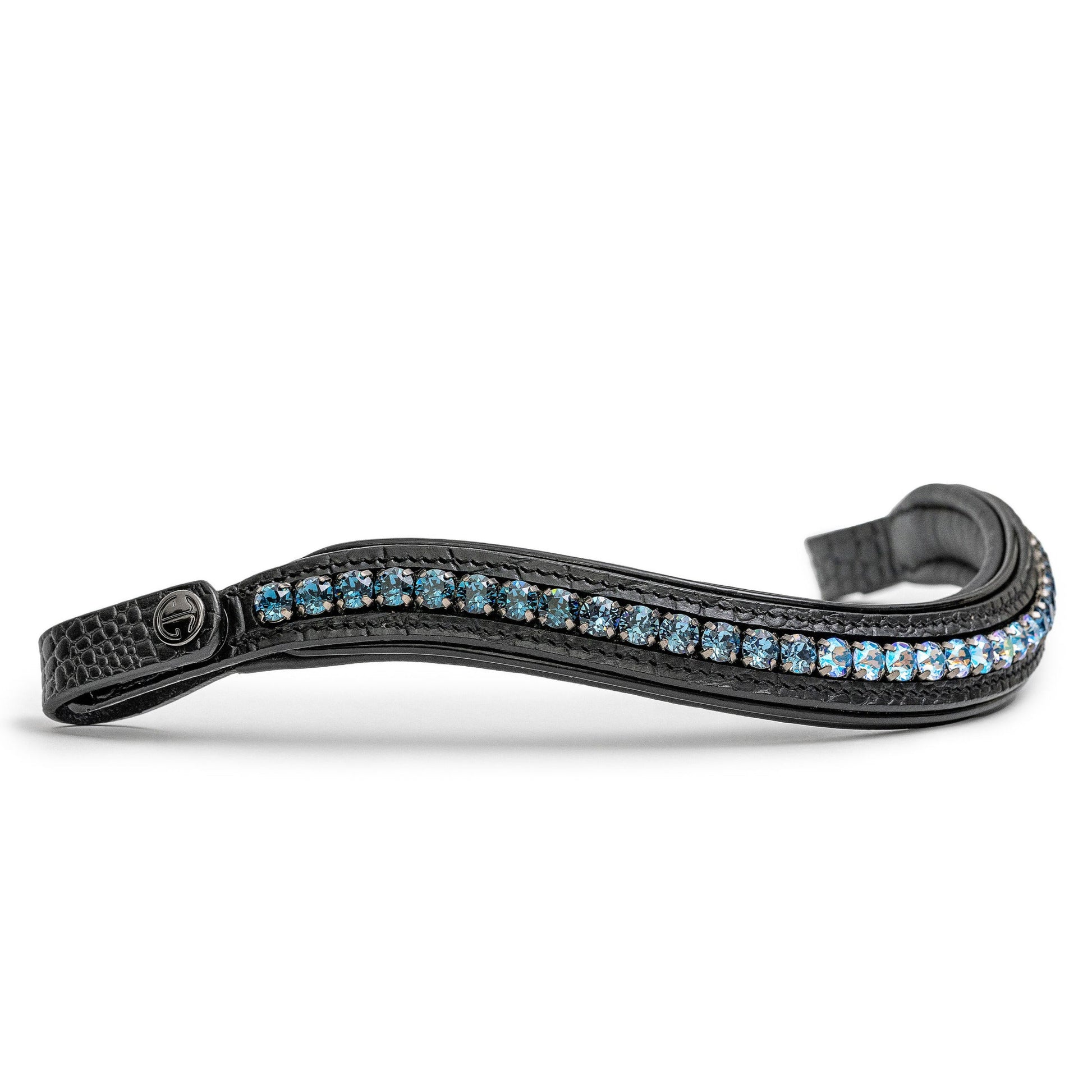 Featuring boldly elegant black croc printed leather on the anatomical noseband and browband, plush black nappa padding, black patent piping and a scintillating ombre crystal design browband.