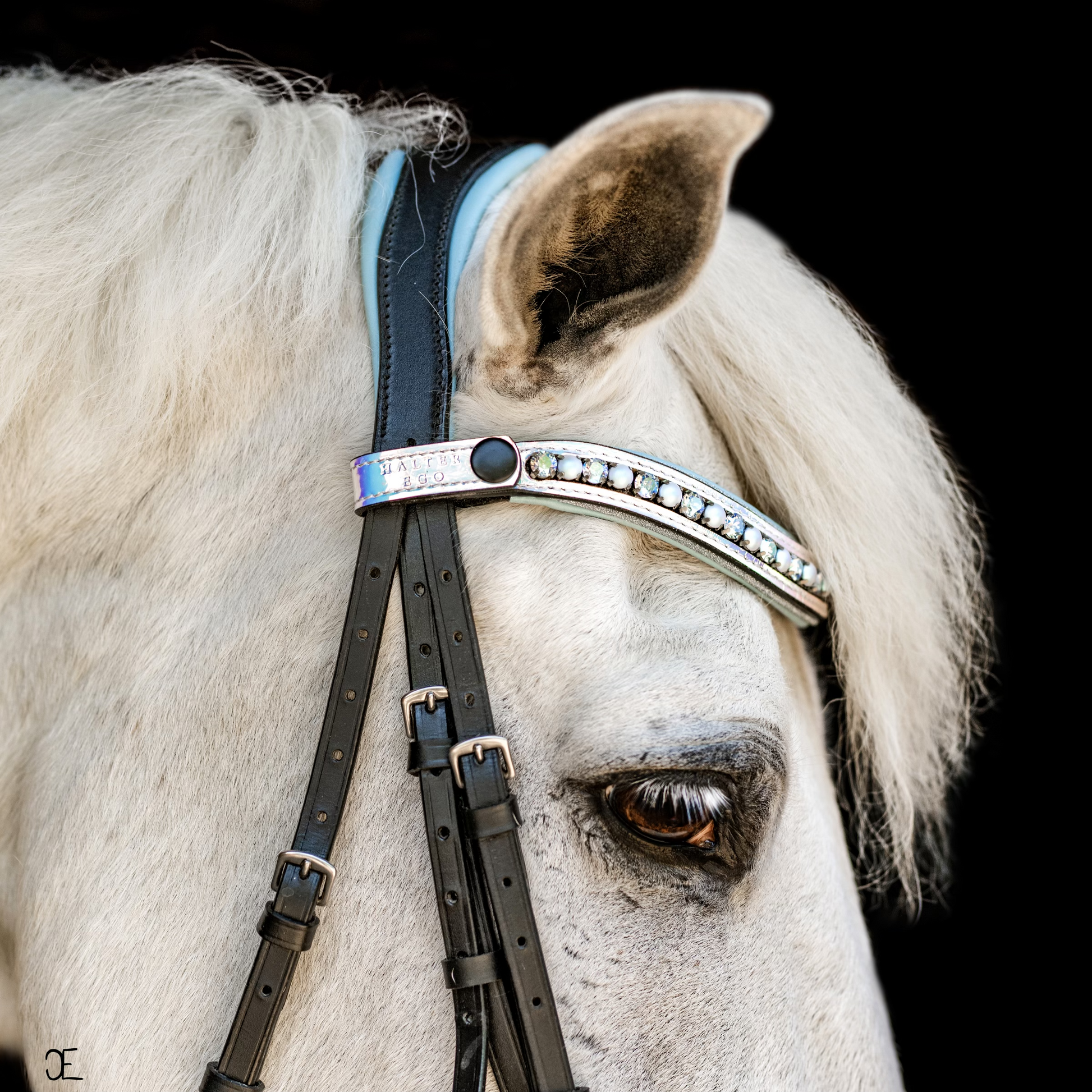 - Anatomical crownpiece with Light Blue Colored Nappa Padding