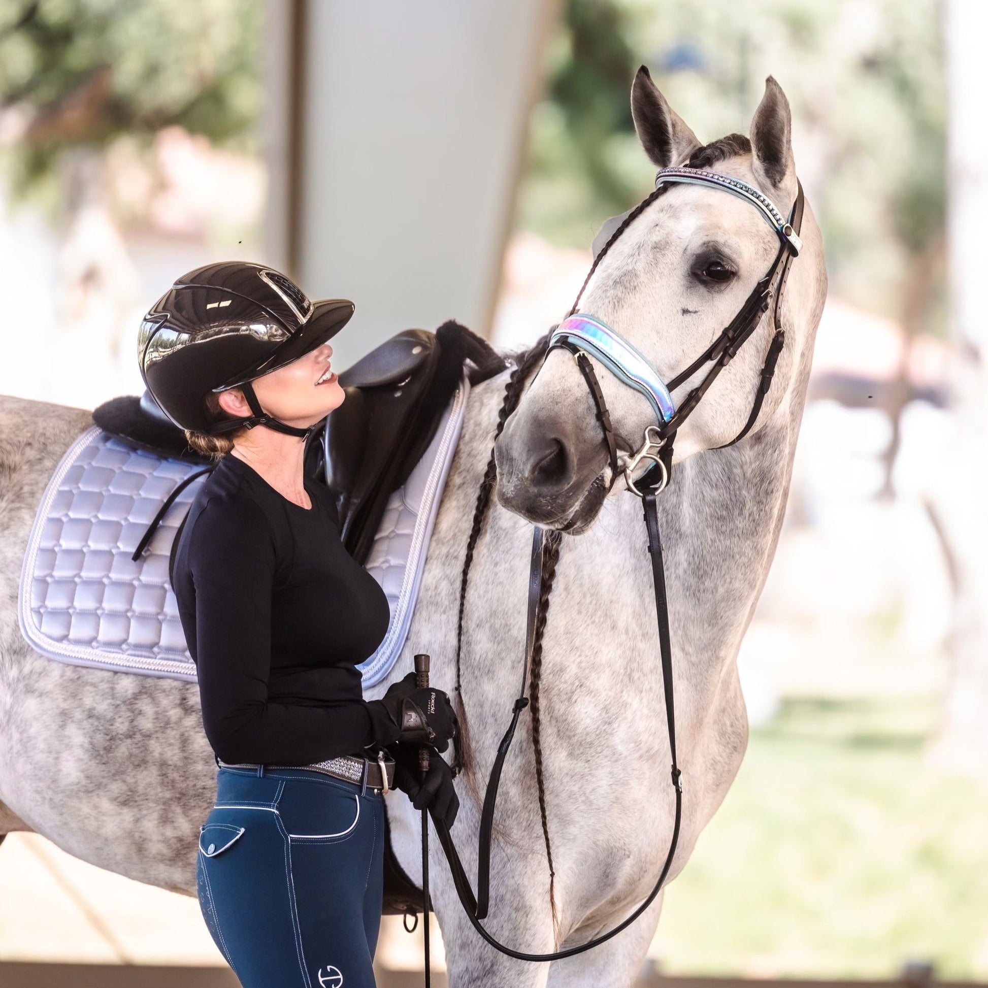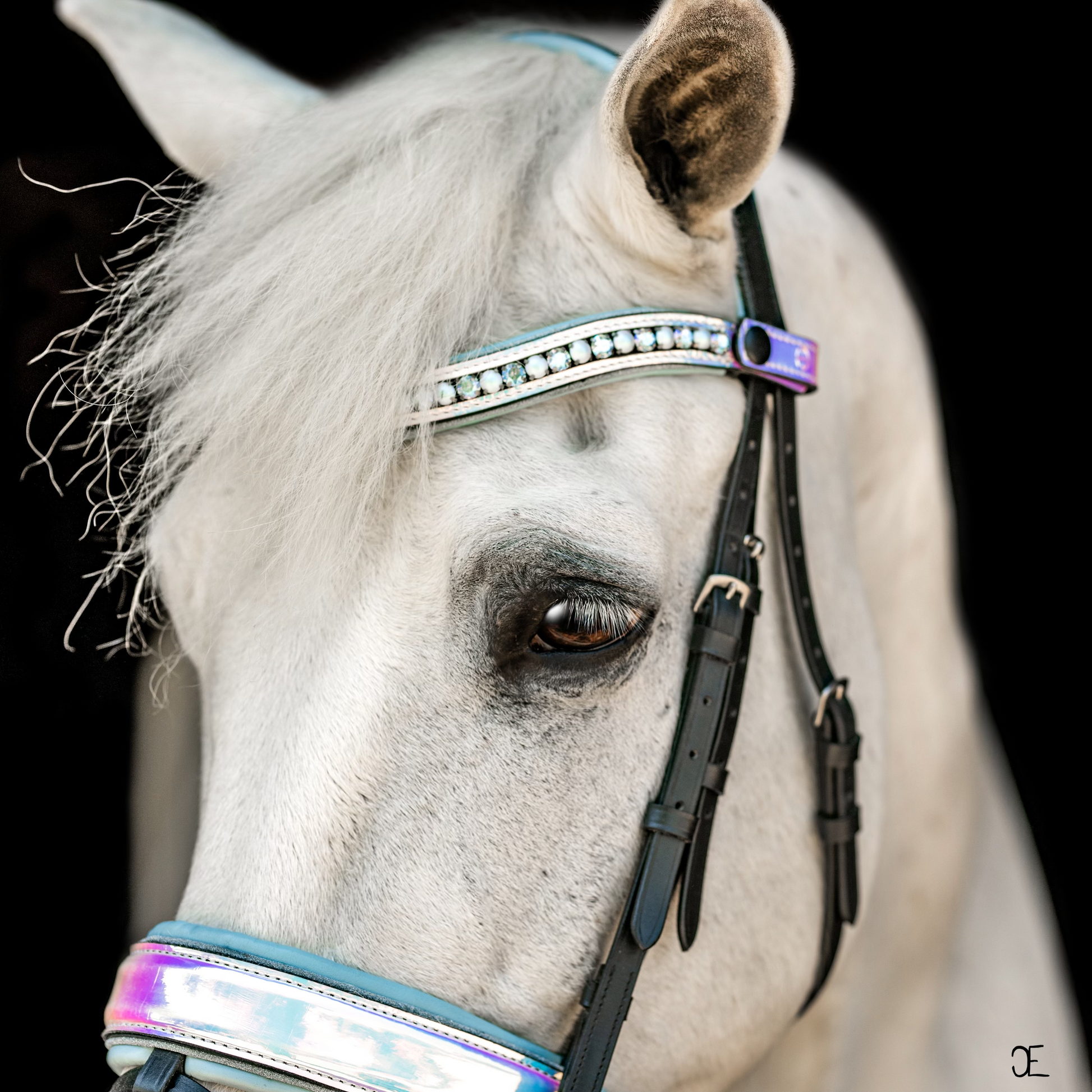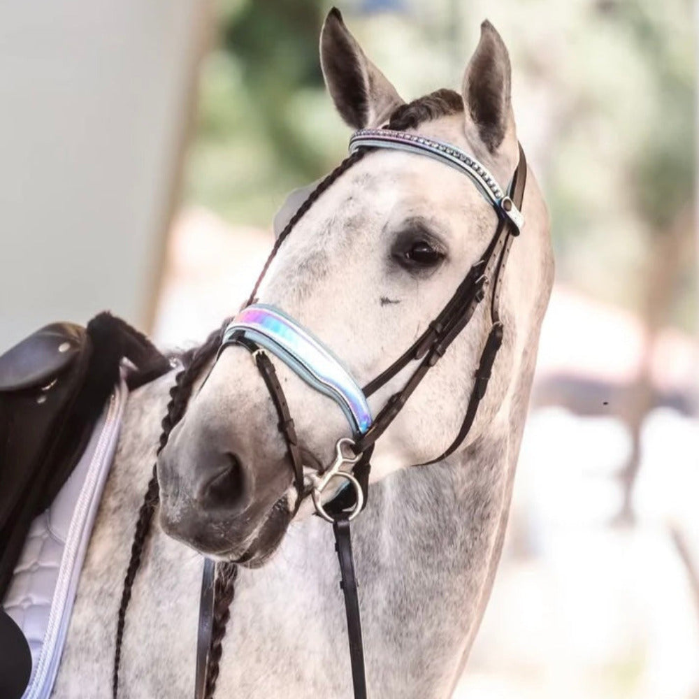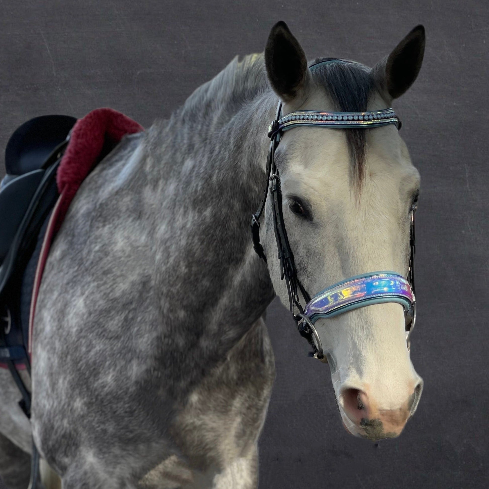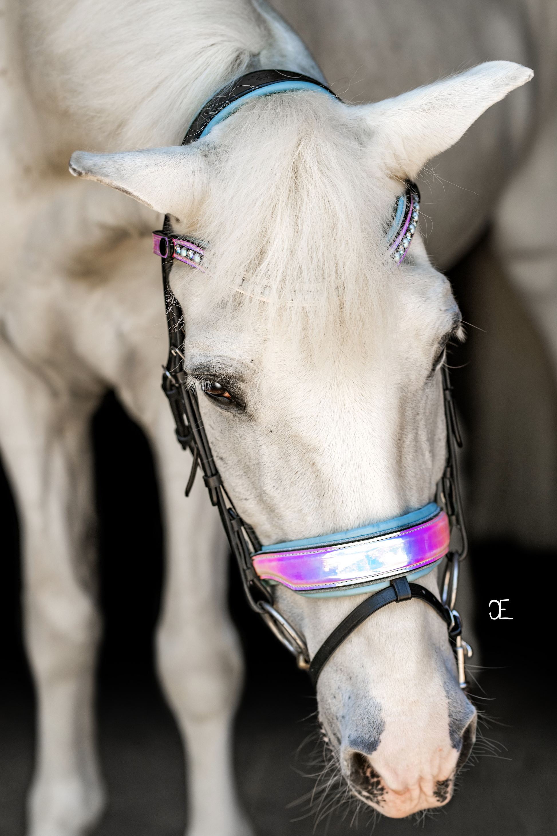 The 'Elsa' neon patent snaffle bridle is a truly unique and stunning combination of comfort and style. The Neon Patent leather is complimented by a light blue nappa leather padding and metallic blue piping creating a mesmerizing, and gorgeous design!