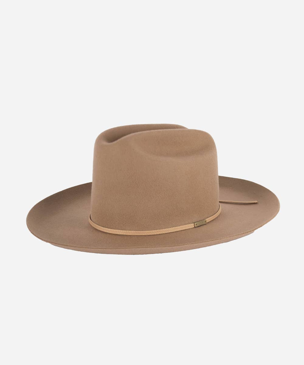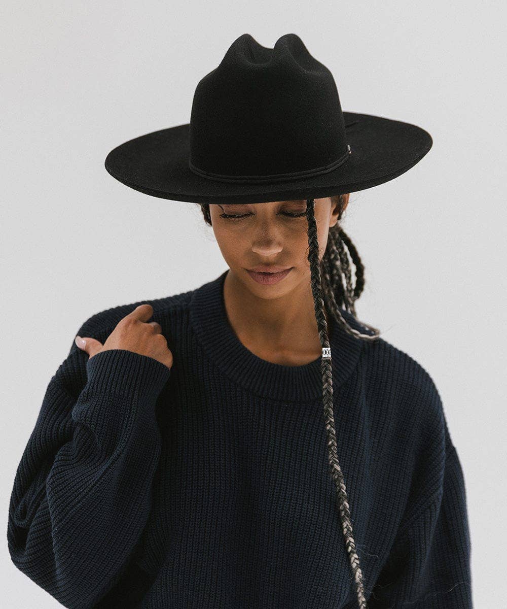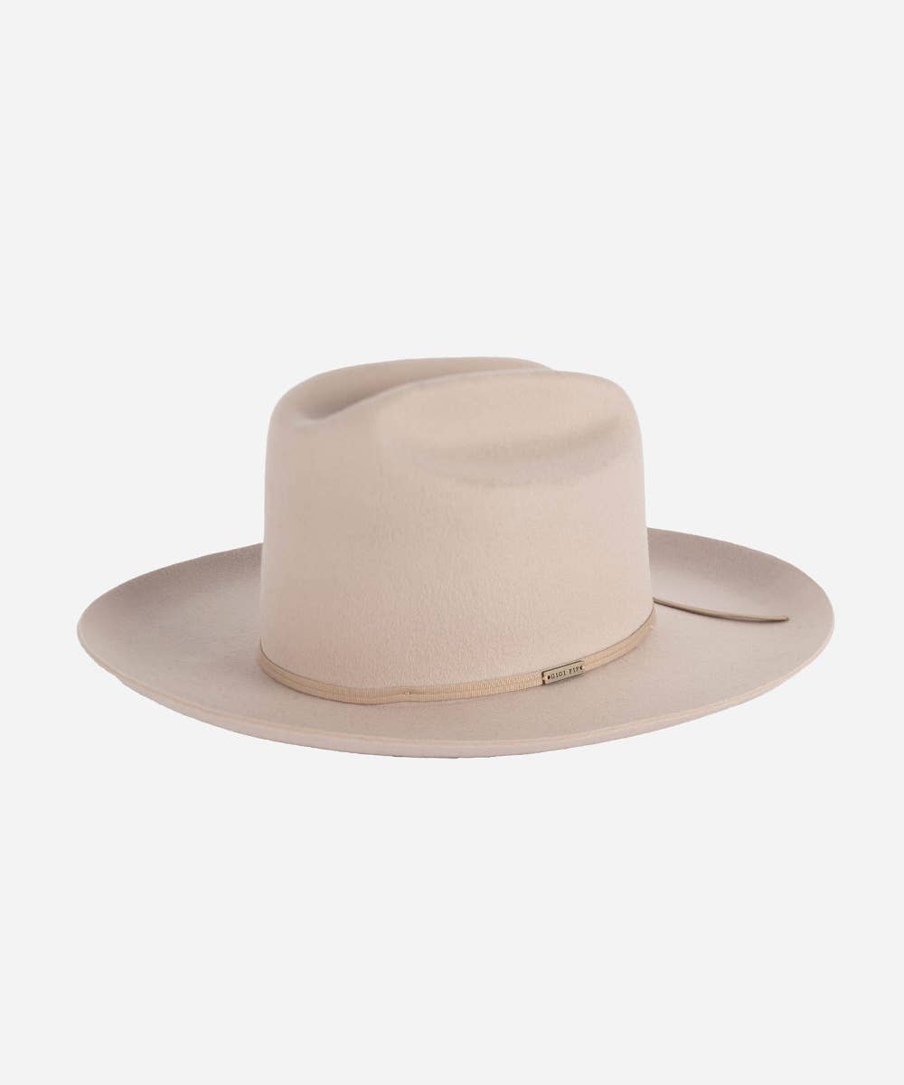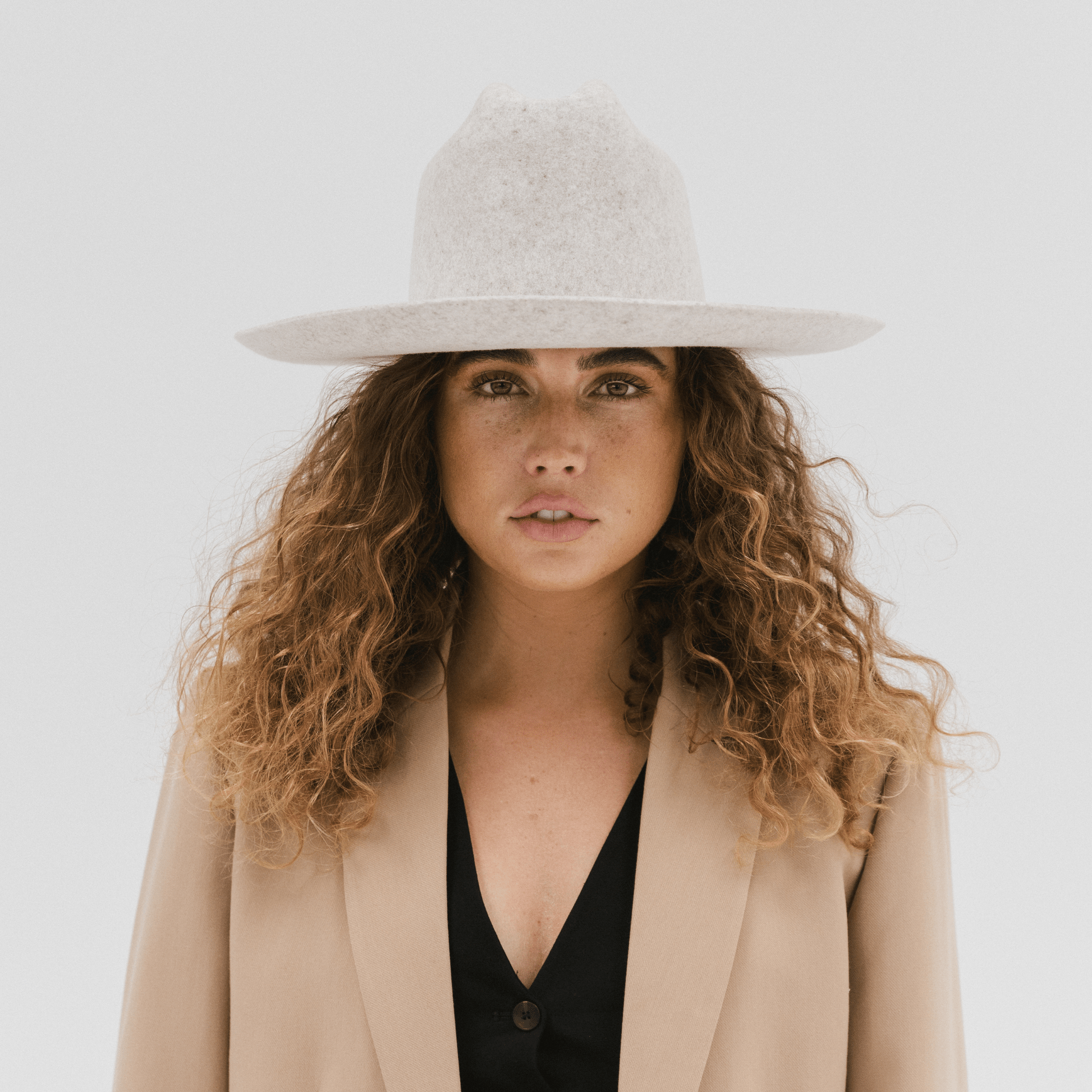 Ezra blends statement fashion with Western. A classic cattleman crown made to be styled for the city as much as the countryside. This hat features an upturned brim + a tall crown, giving Ezra a modern + feminine feel.