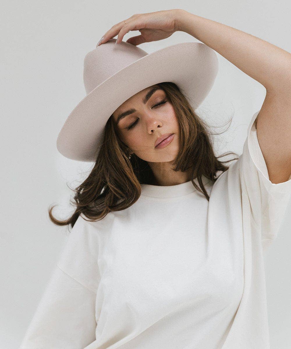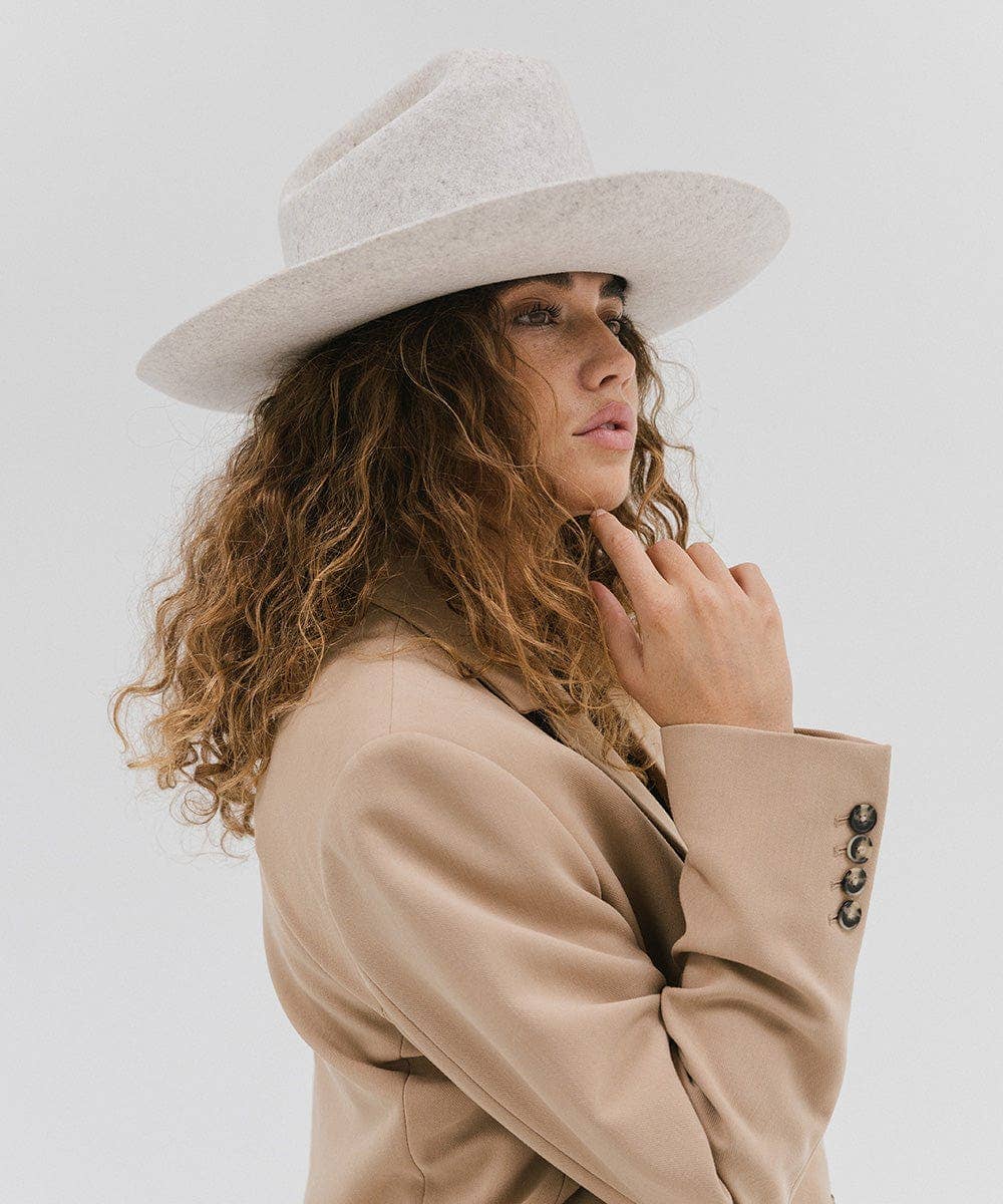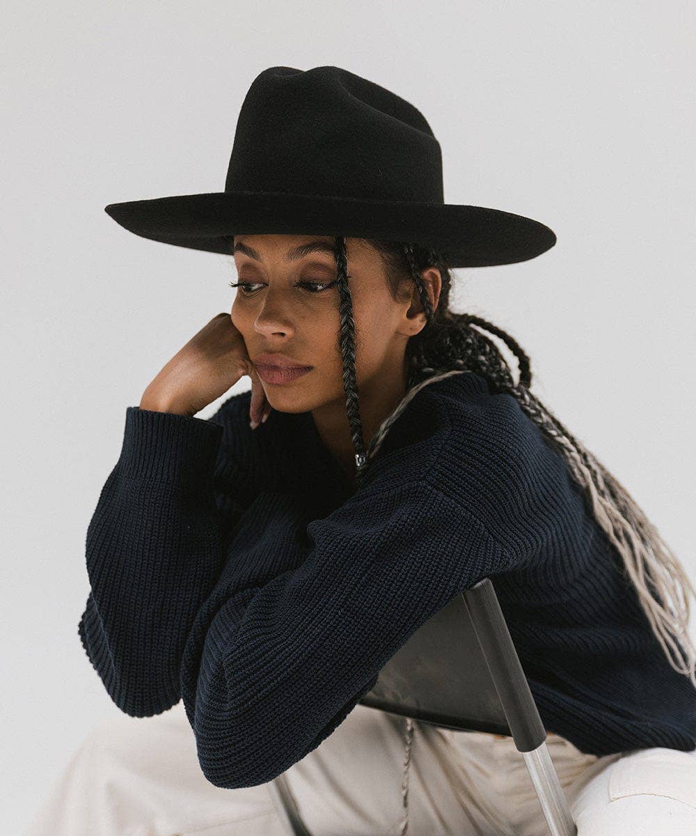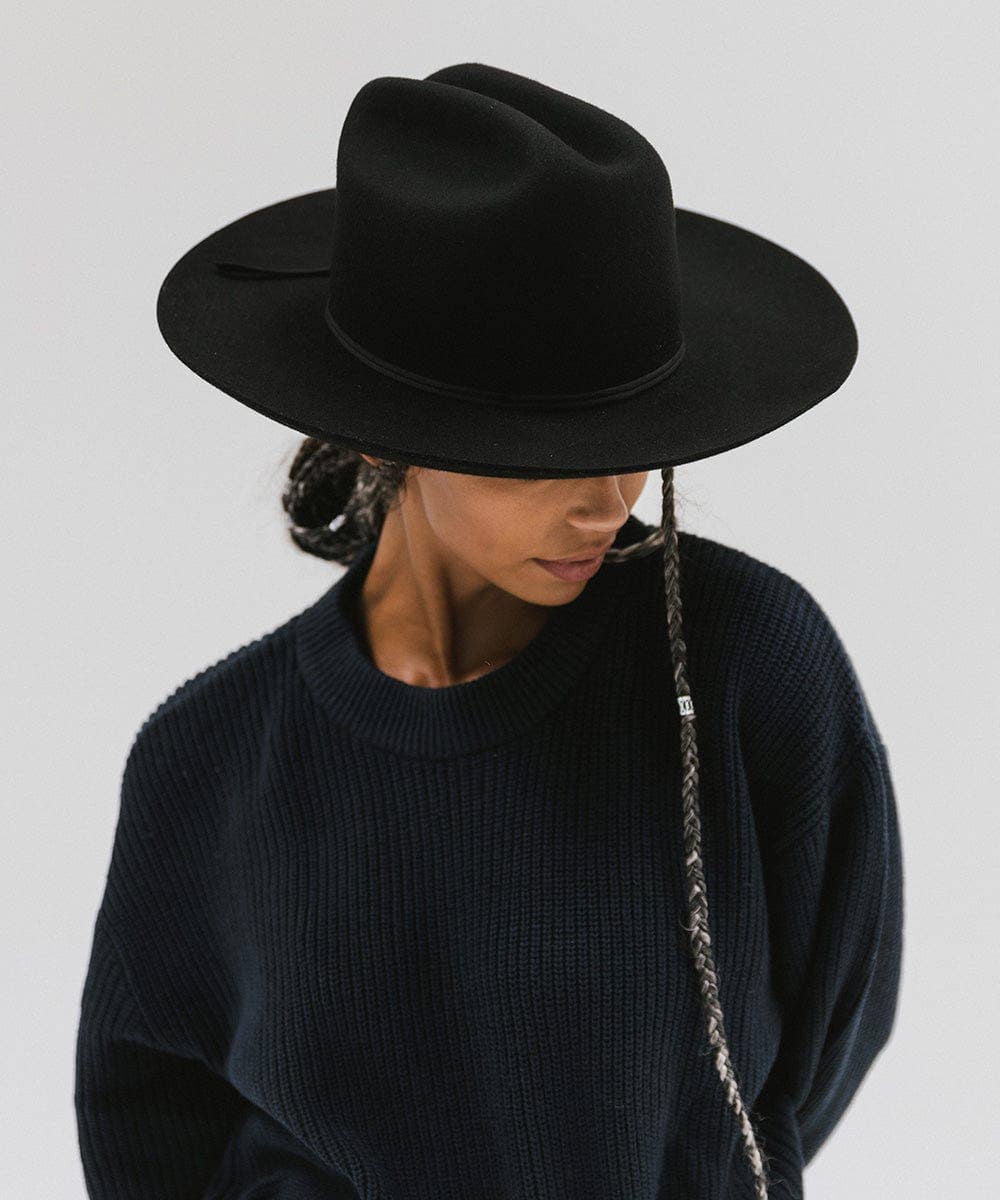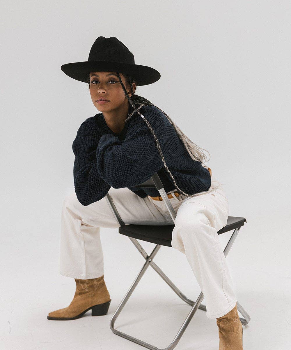 Ezra blends statement fashion with Western. A classic cattleman crown made to be styled for the city as much as the countryside. This hat features an upturned brim + a tall crown, giving Ezra a modern + feminine feel.