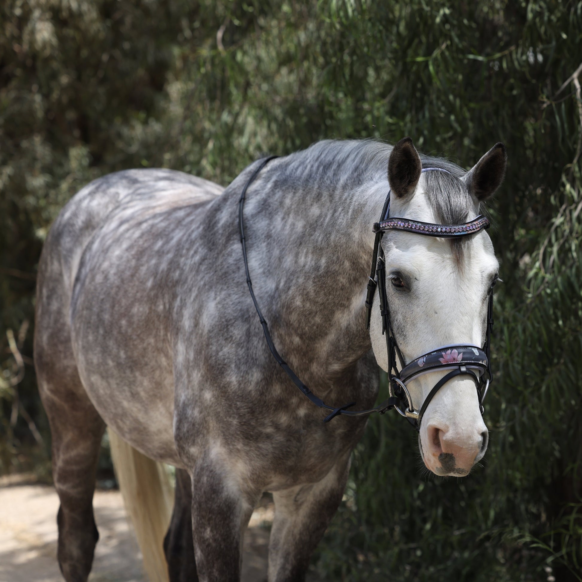 Featuring a very limited edition abstract floral print leather on the noseband and browband, with plush lavender padding and black patent piping - this design is innovative, bold and classy - perfect for the discerning equestrian who likes to stand out from the crowd for all the right reasons!