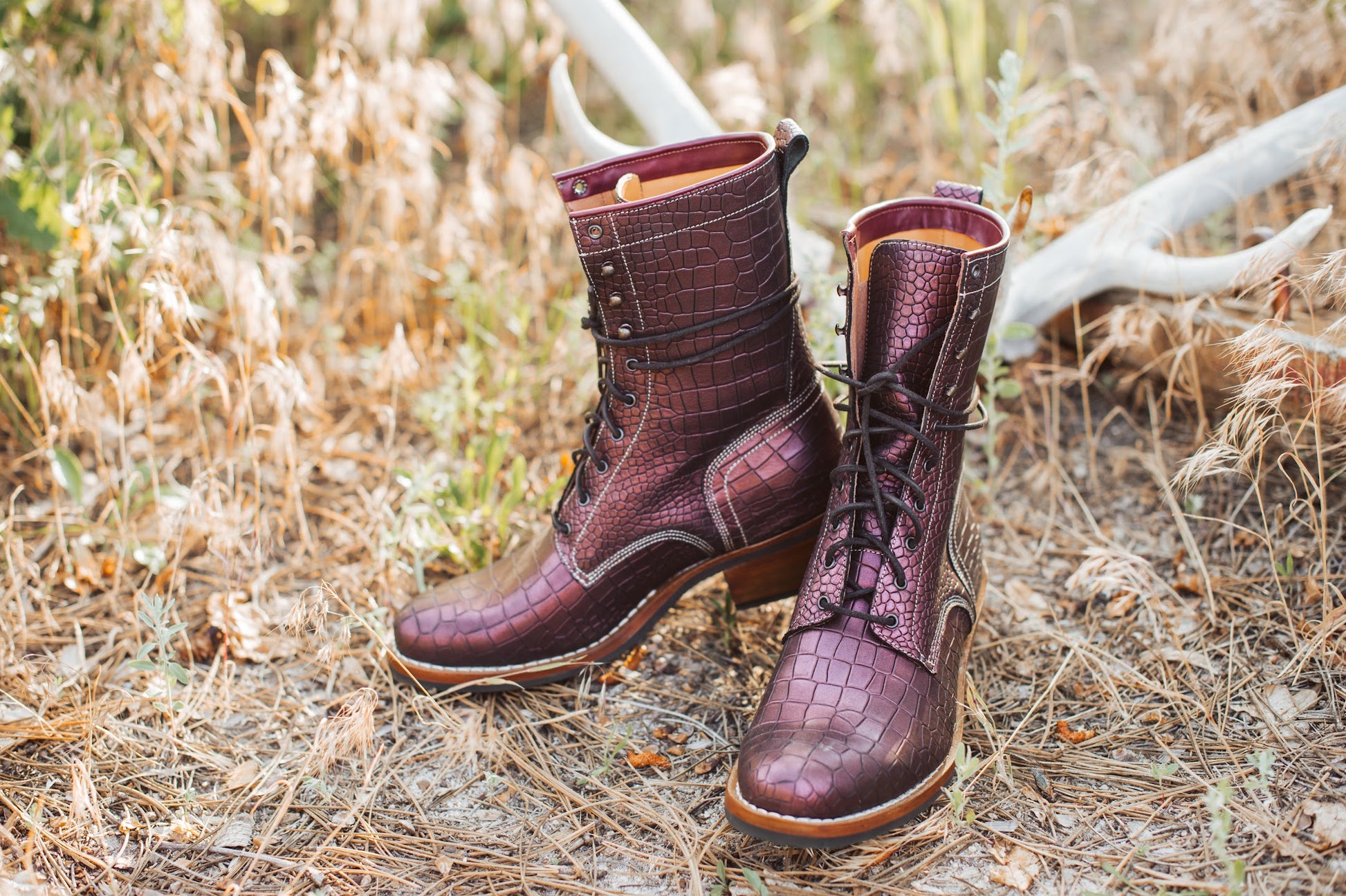The Freya brings a feminine twist to your favorite combat boot. Lace up, gator printed calfskin, and a small heal.