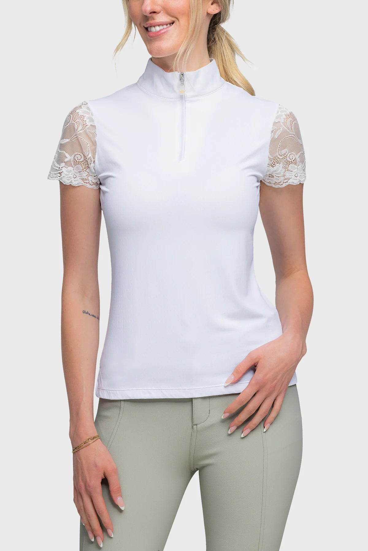 Our super soft, stretchy, feminine lace galloon cap sleeve ¼ zip in sleek, classic back will be your next favorite. On the course, in the ring this lifestyle piece is a must have.