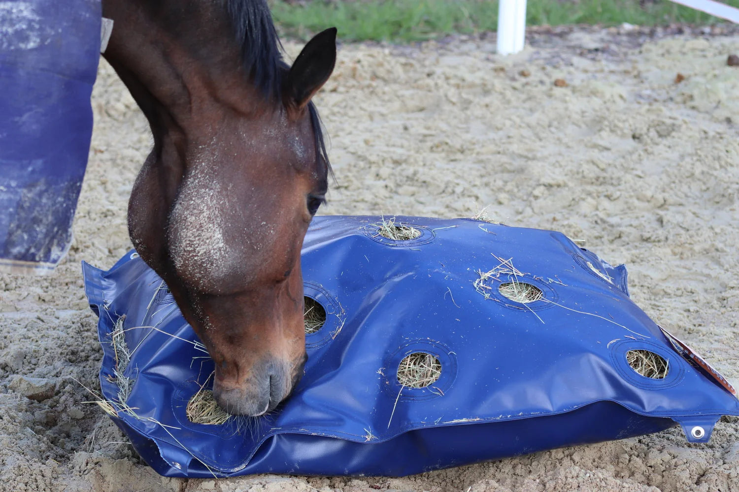 Non-toxic, ultra-durable, easy fill, slow-feed hay bag that will hold almost a bale of hay. It can be hung in a stall / trailer, be used indoors or out as a ground feeder and enrichment toy, or as part of a track system. Useful for horses, donkeys, sheep, and goats.