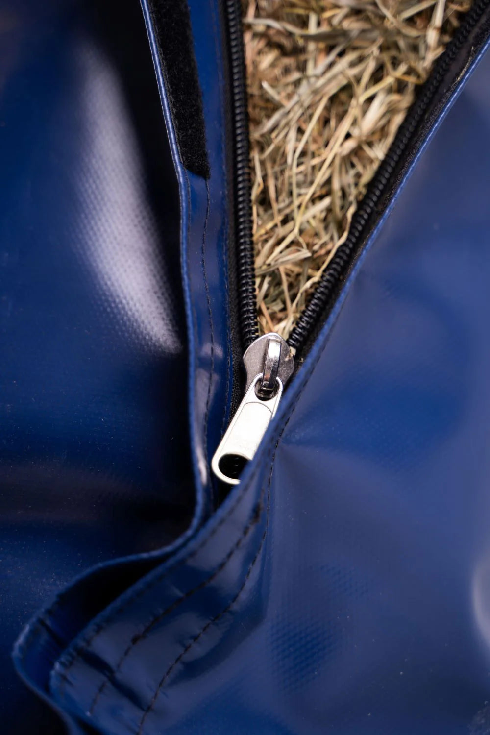 Made of heavy-duty, weatherproof, PVC-coated material, this bag can stand up to the toughest conditions. It will not weaken in extremely cold or hot temperatures. Heavy-duty zipper and velcro closure make it easy to fill. Solid back keeps hay clean when ground feeding, or you can hang it in the stall using the heavy-duty mounting holes.