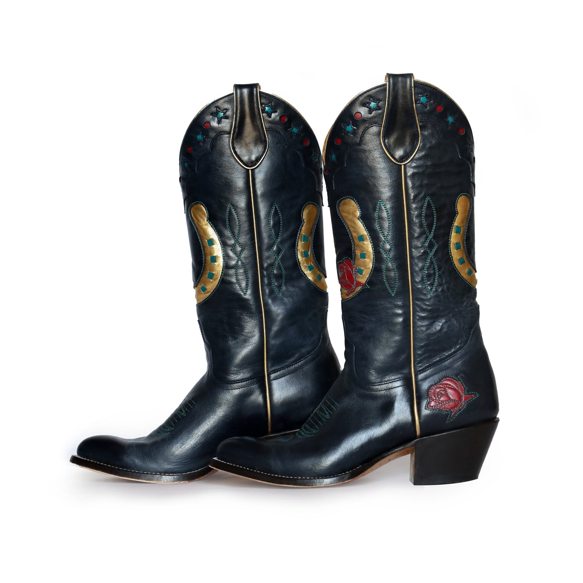 Lucky horseshoe in gold along with gold piping, rose detail on counter on rich navy leather, turquoise stitching, dots and stars lining the collar a timeless look for all the horse loving ladies -
