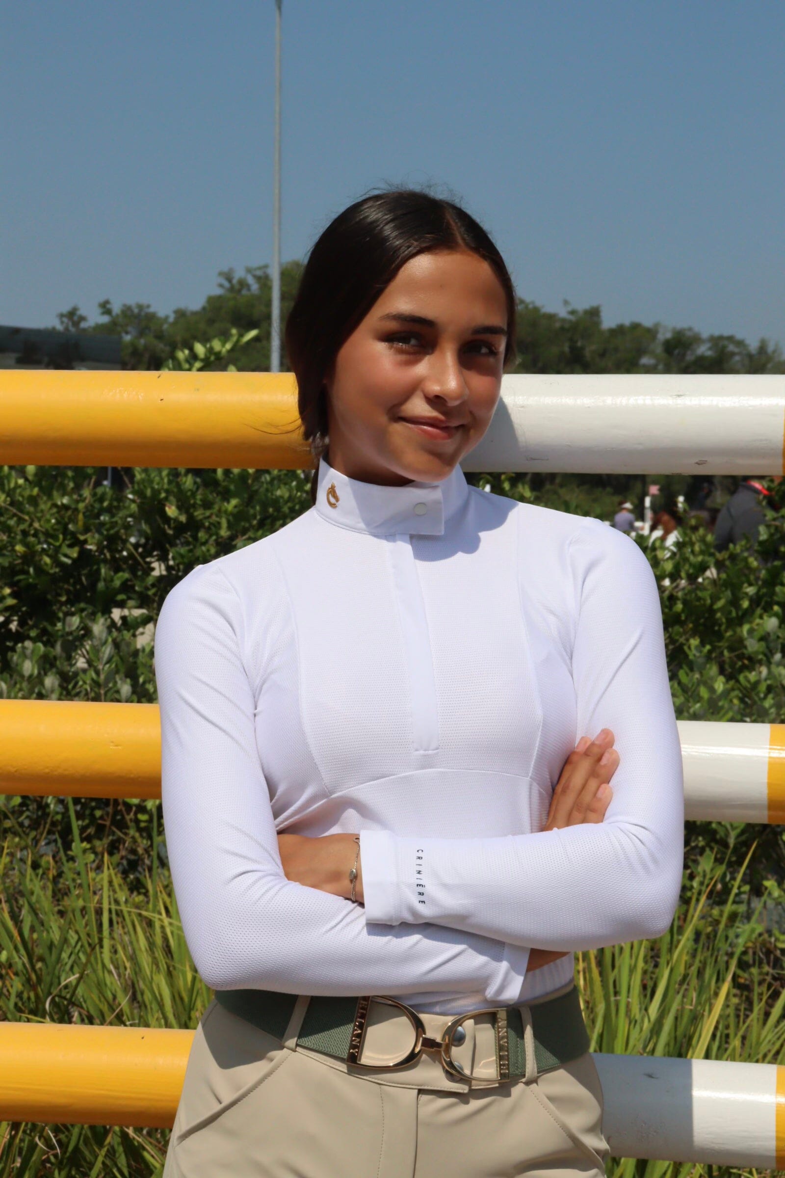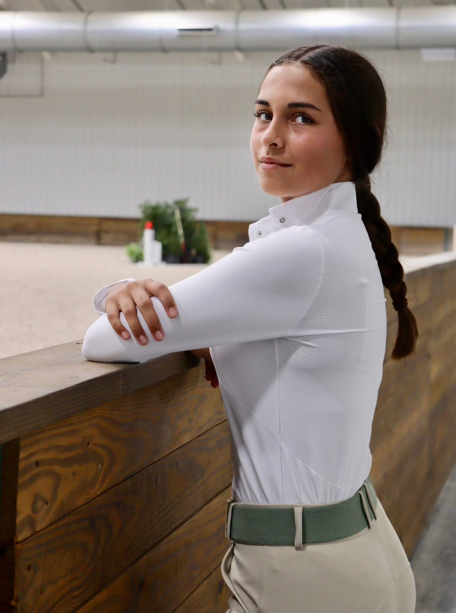 Channel your inner champion with The Winner's Edge Monique Mesh. This sophisticated slim-fit competition top for women exudes both confidence and practicality. It's crafted from a lightweight, breathable white mesh fabric that keeps you cool and comfortable during any competition. The clean, all-white design is a timeless classic, allowing you to focus on your performance. The sleek long sleeves provide just the right amount of coverage, while the easy-to-zip closure offers a secure fit. For a touch of adjustability, a single snap at the neck allows you to create a more covered look when needed. This versatile all-season top will quickly become a favorite in your competition wardrobe.