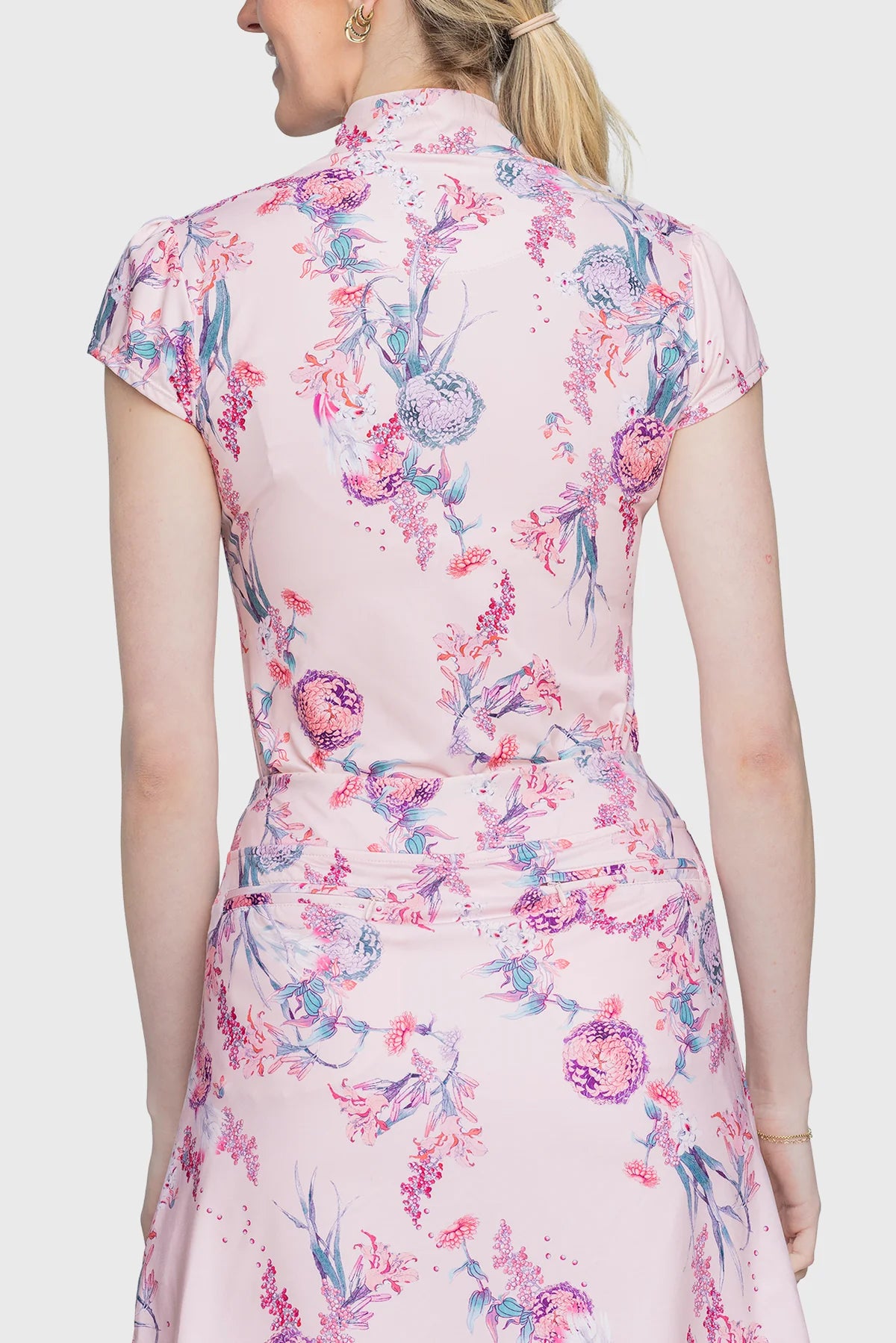 Beautiful shades of pink, blush, fuchsia and soft jade make this tea garden floral a stunner, 1/4 zip, UPF 30 and soft 4-way stretch fabric in a contemporary fit