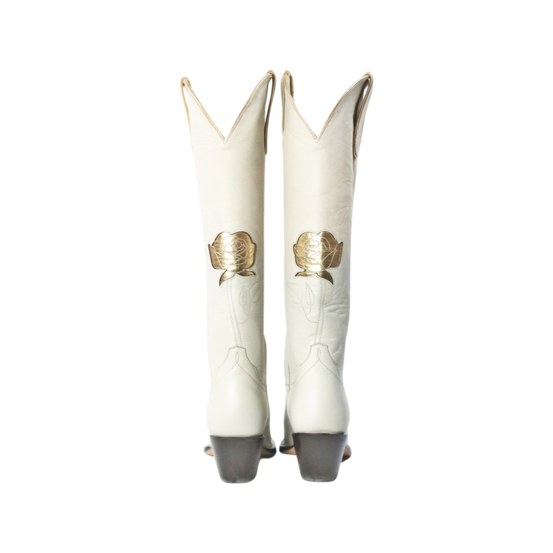 Our fan favorite in San Antonio Rose boot in cream and gold with gold piping - get ready to stop traffic!