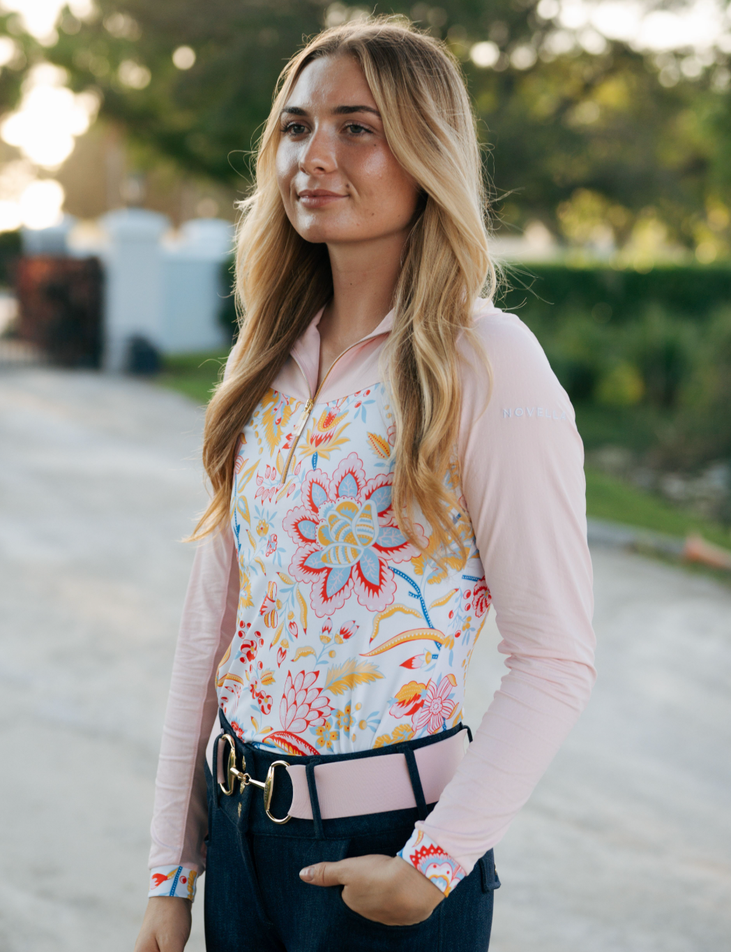 The Bunny Long Sleeve sun-shirt features a vintage chintz floral pattern and a mesh panel under the armpit for breathability. With a deep quarter-zip and a pastel pink color block, this shirt goes with any color pant and highlights your equitation. White Novella branding embroidery are featured on the left arm and upper back. True to size but adapts to your body’s changes - this top gives you a perfect fit every time. UPF 30+ for added ultra-violet protection.