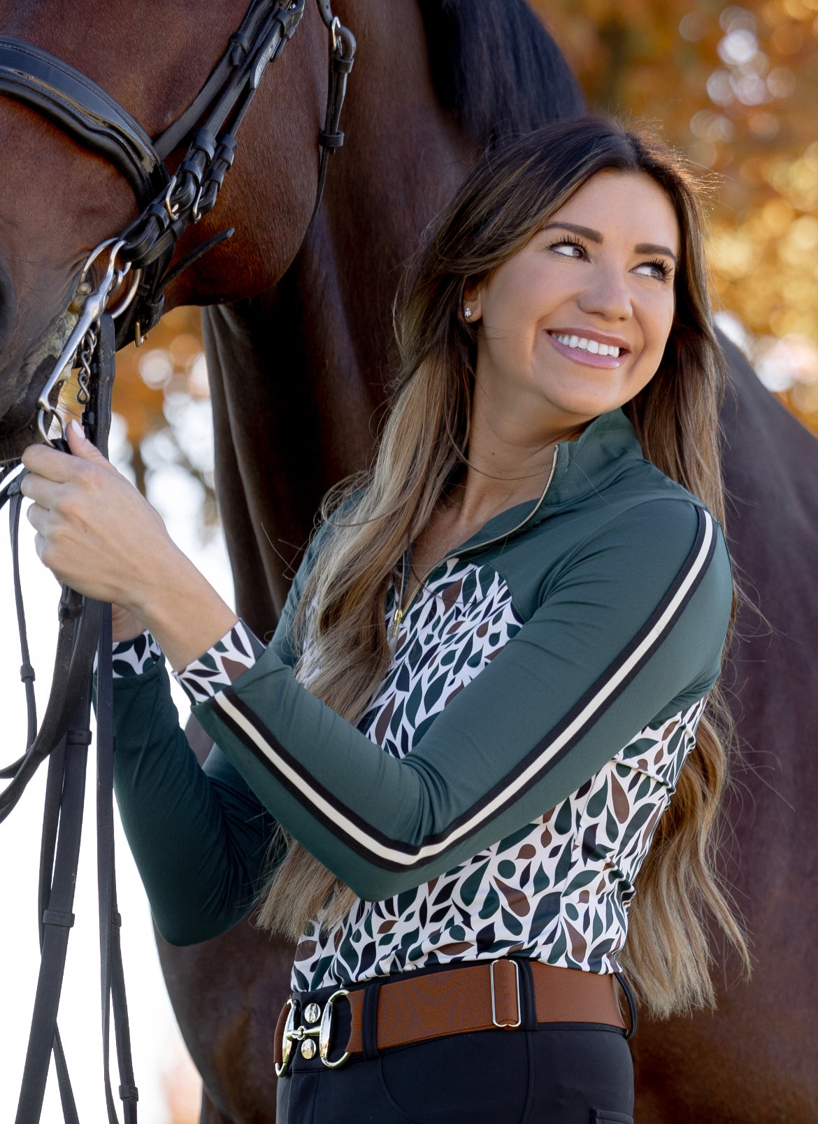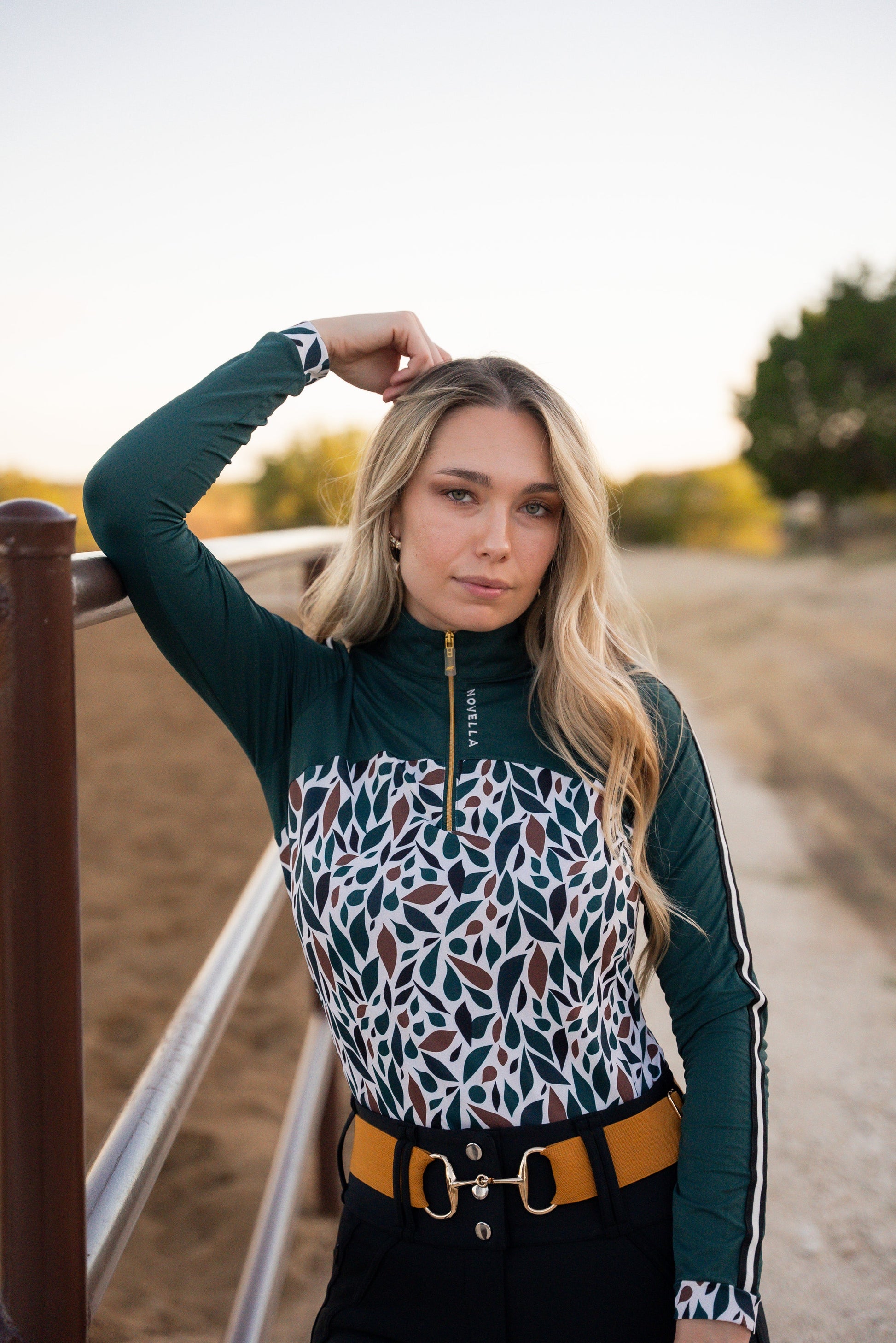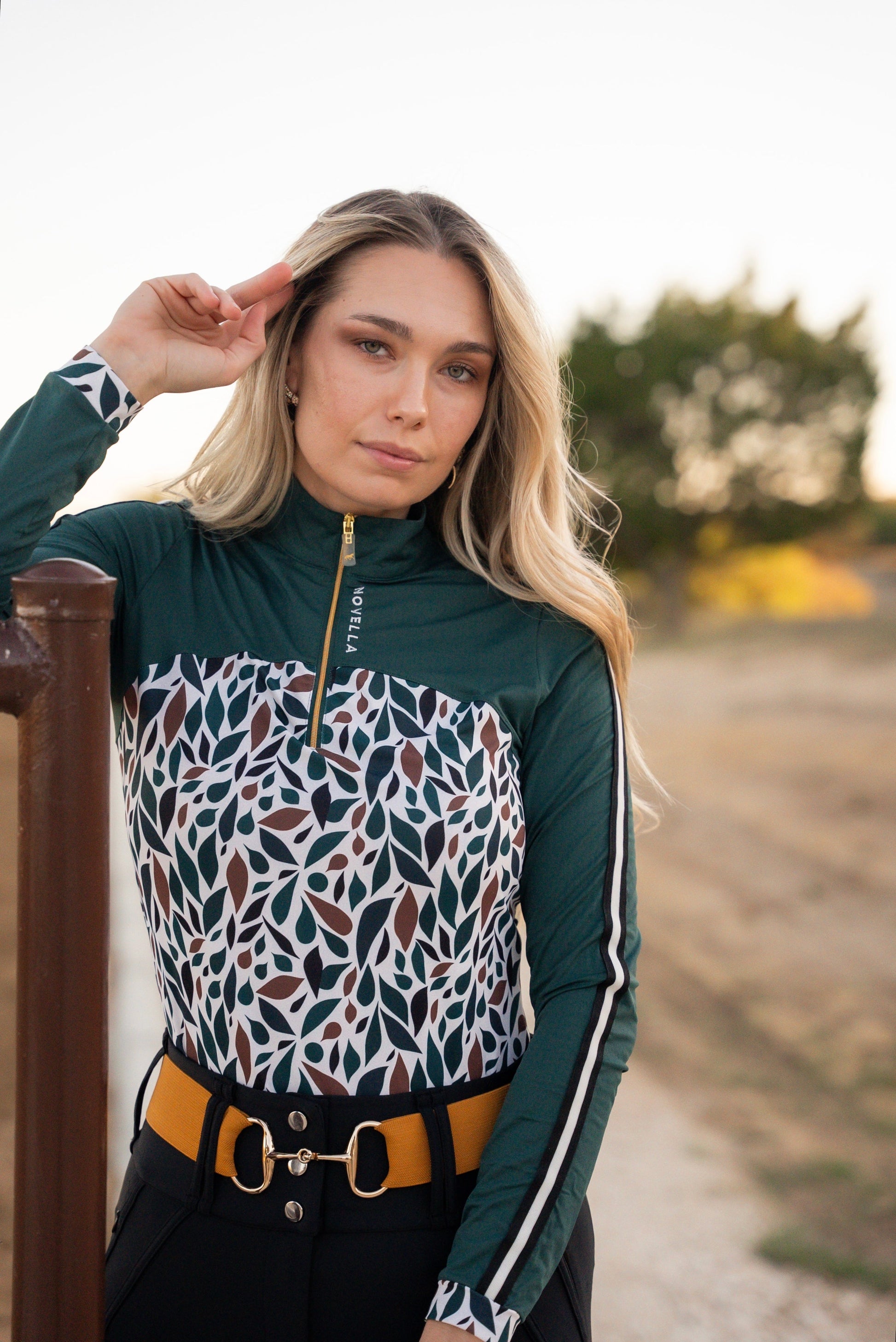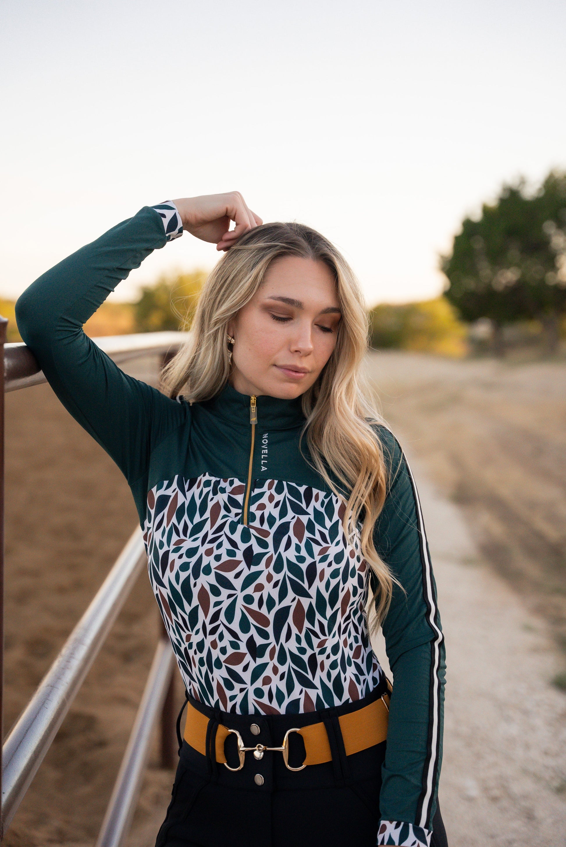 The Copperfield is equal parts woodsy, polished and sporty. It features a brown, black, cream and hunter green palette with a sporty stripe down the sleeve. Perfect with beige, black OR brown breeches -- this is a new Novella favorite. UPF 30+ for added ultra-violet protection and a deep gold zipper for a flattering neckline.