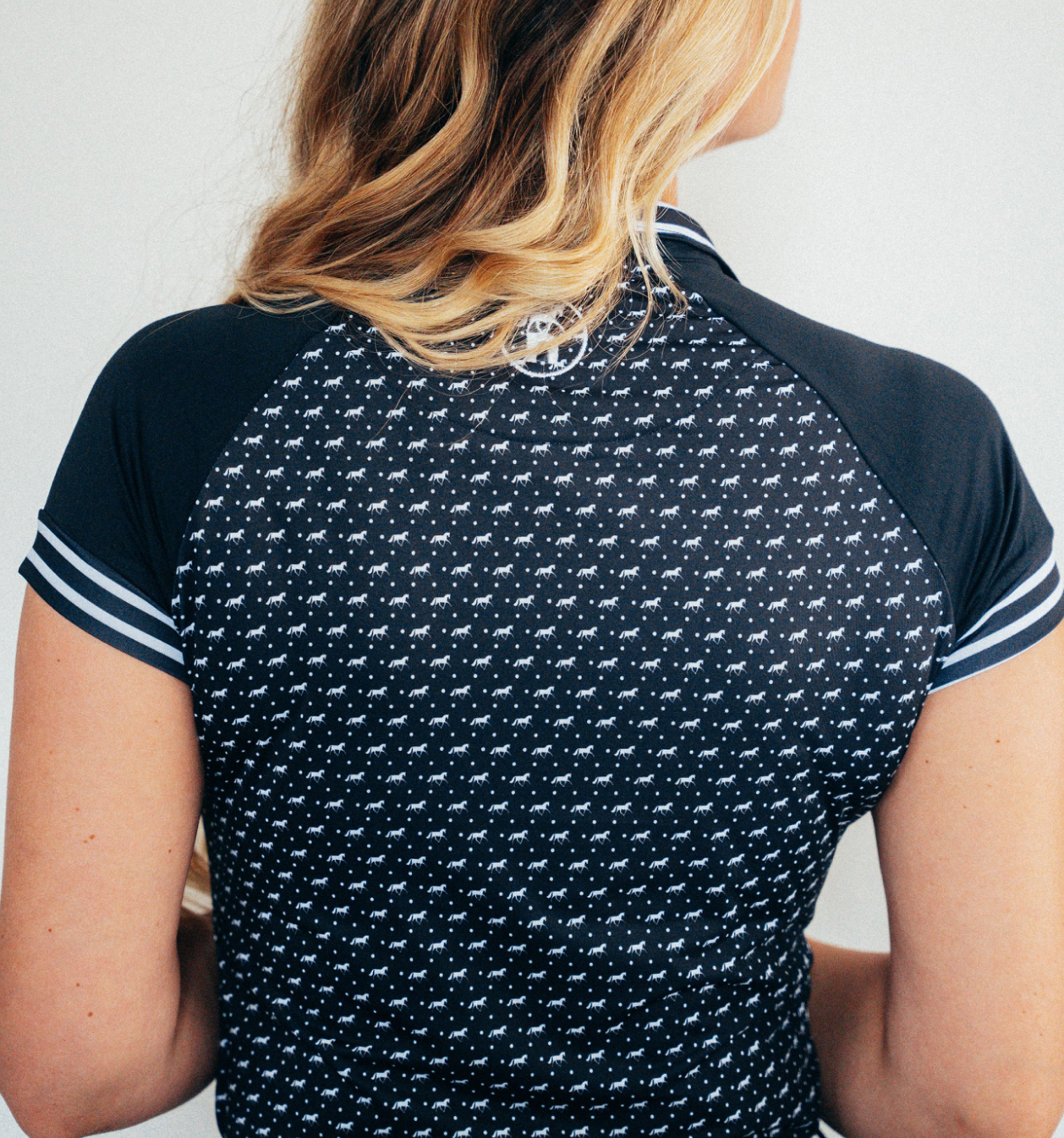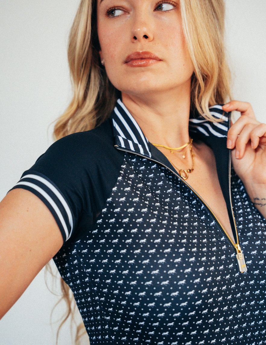INSPIRED BY DEVIN, a classic bay thoroughbred who did it all -- from racing, hunter jumpers and dressage. This shirt is all about versatility -- with mini NOVELLA horses & polkadots woven throughout, this shirt is a must have for riding, golfing or lounging. Super classic, this design includes a cap sleeve and a deep quarter-zip for a flattering look. Within the collar, you'll find a thoughtful black and white striping detail to match the cuff.