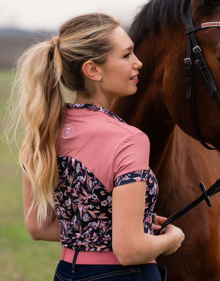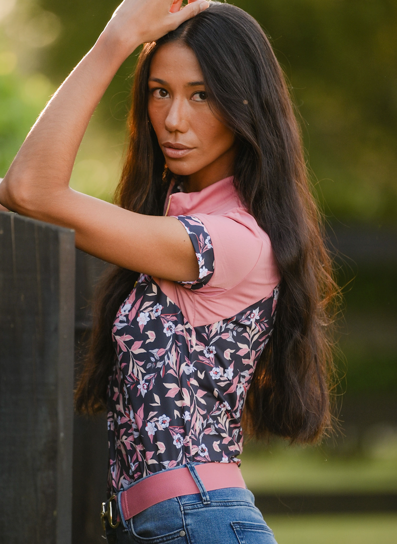 The Leah sun-shirt features an amazing Dusty Rose pink color highlighted with a navy floral. The long sleeve version features a full mesh underarm for complete breathability, a deep gold quarter-zip and an adorable floral collar. Perfect with navy breeches or jeans, this will be your new favorite Novella. True to size but adapts to your body’s changes, this sun-shirt gives you a perfect fit every time. UPF 30+ for added ultra-violet protection.