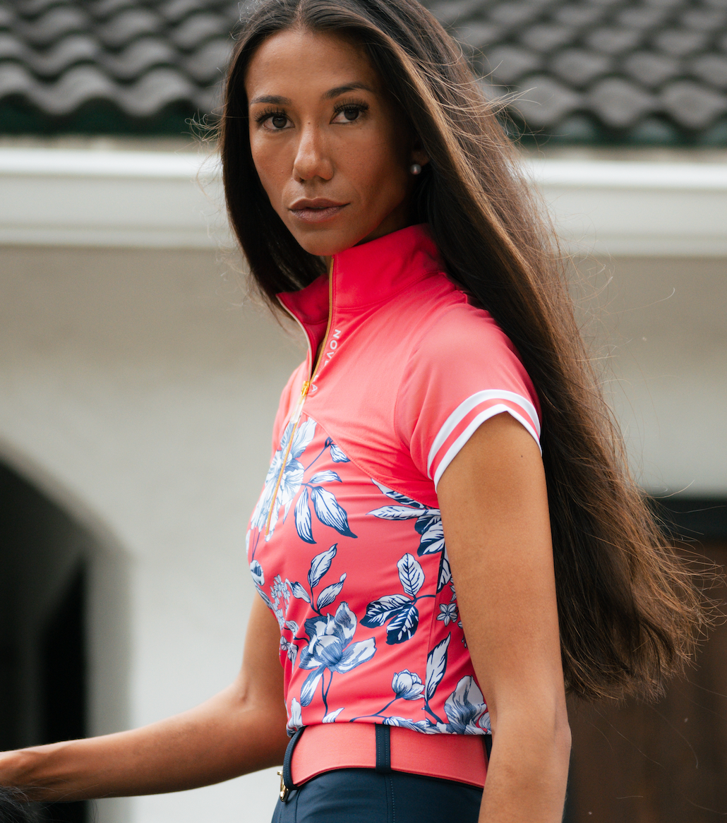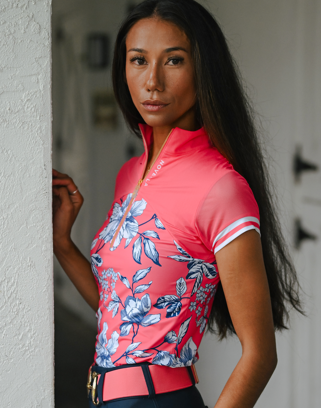 INSPIRED BY MALIBU, a mare who loves all eyes on her and is as brave as she is beautiful. The Malibu Short Sleeve features an amazing tropical print in 'floral coral' -- representing the bold and fun attitude this special horse portrays.