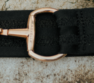 The Novella Snaffle Belts in Black -- Black Beauty 2 inch, Black and White Stripe 1.5 inch, Glimmer Black 1.5 inch - features an etched gold snaffle with the Novella logo to match every one of your Novella styles. This piece really ties your Novella look together! The elastic is either 2 or 1.5 inches wide for great support and stunning finished look.