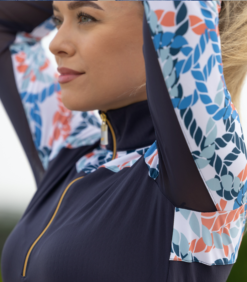 The Odilon Long Sleeve style features a playful and nautical design against a beautiful navy contrast - for total figure flattery. The full mesh underarm keeps you cool but protected from the sun and the teal, melon and navy palette is one of the most youthful patterns Novella has launched. With melon embroidery on the arm and back and a deep gold quarter-zip, this design gives you peace of mind with UPF 30+ Novella sun protection you know and love.