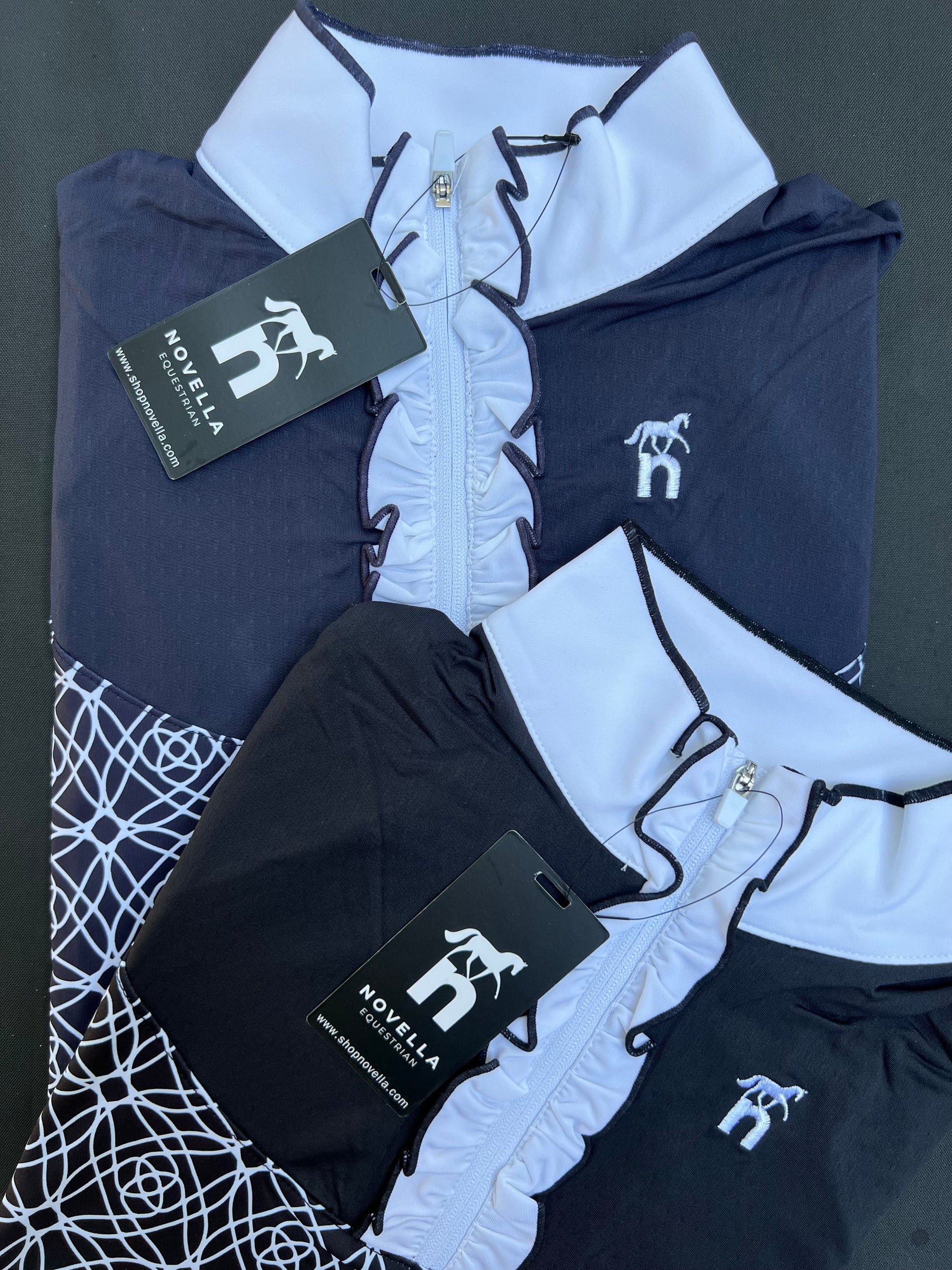 The Raymeister Show Shirt is a literal show-stopper complete with a US Equestrian approved Integrated Collar for the dressage show ring. Say goodbye to uncomfortable stock ties and just zip and go to give you a polished look in the ring. This shirt is also approved to wear when coats are waived and can be worn as an adorable clinic or schooling shirt. With a low profile zipper, white and black ruffle and roomy collar for breathability, this design is super flattering with a small mesh underarm.