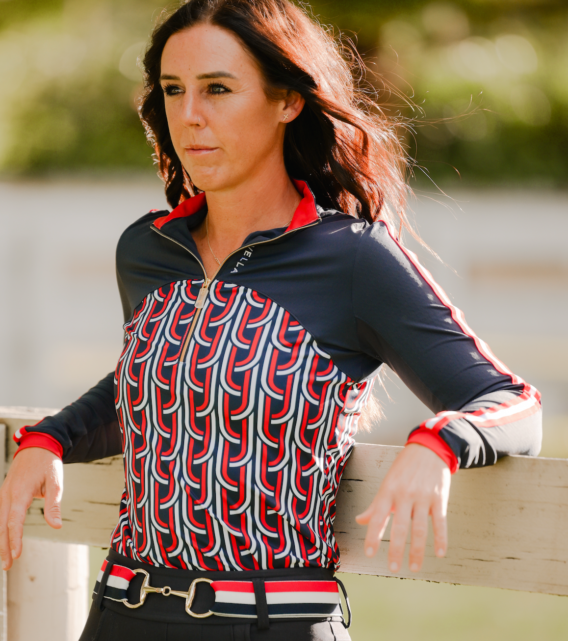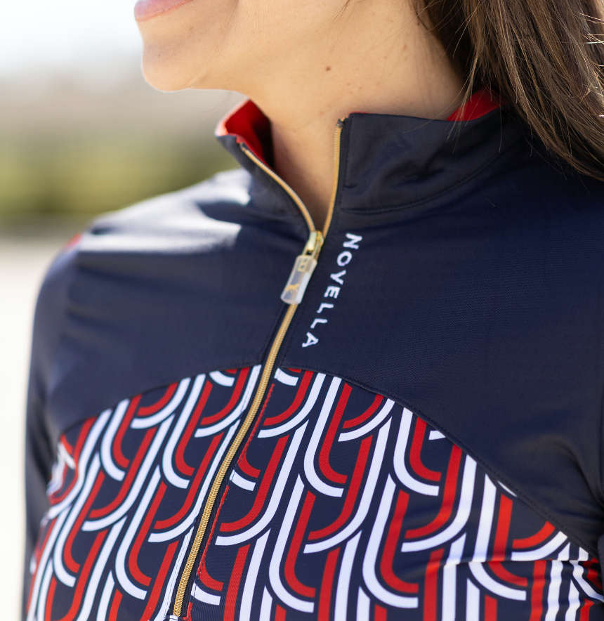 The Team Shirt features a navy base with a contrasting red, white and blue geometric pattern. The long sleeve version features a full mesh underarm for complete breathability, a deep gold quarter-zip and an adorable sporty stripe down the arm. With a red interior collar and cuff, USA badge on the upper back and Novella logo down the zipper - this look is perfect with navy breeches or jeans. True to size but adapts to your body’s changes, this sun-shirt gives you a perfect fit every time. UPF 30+ for added ultra-violet protection.