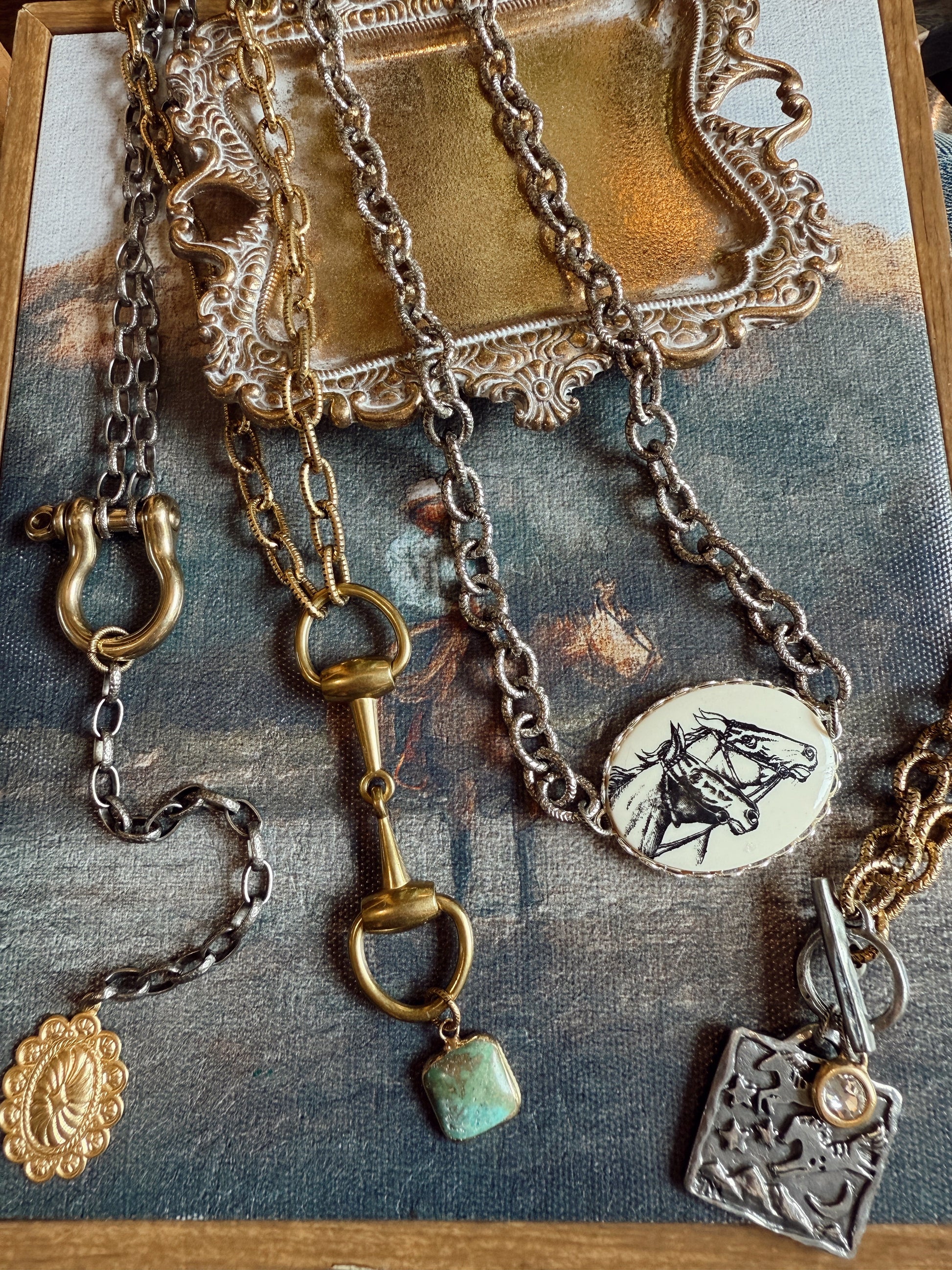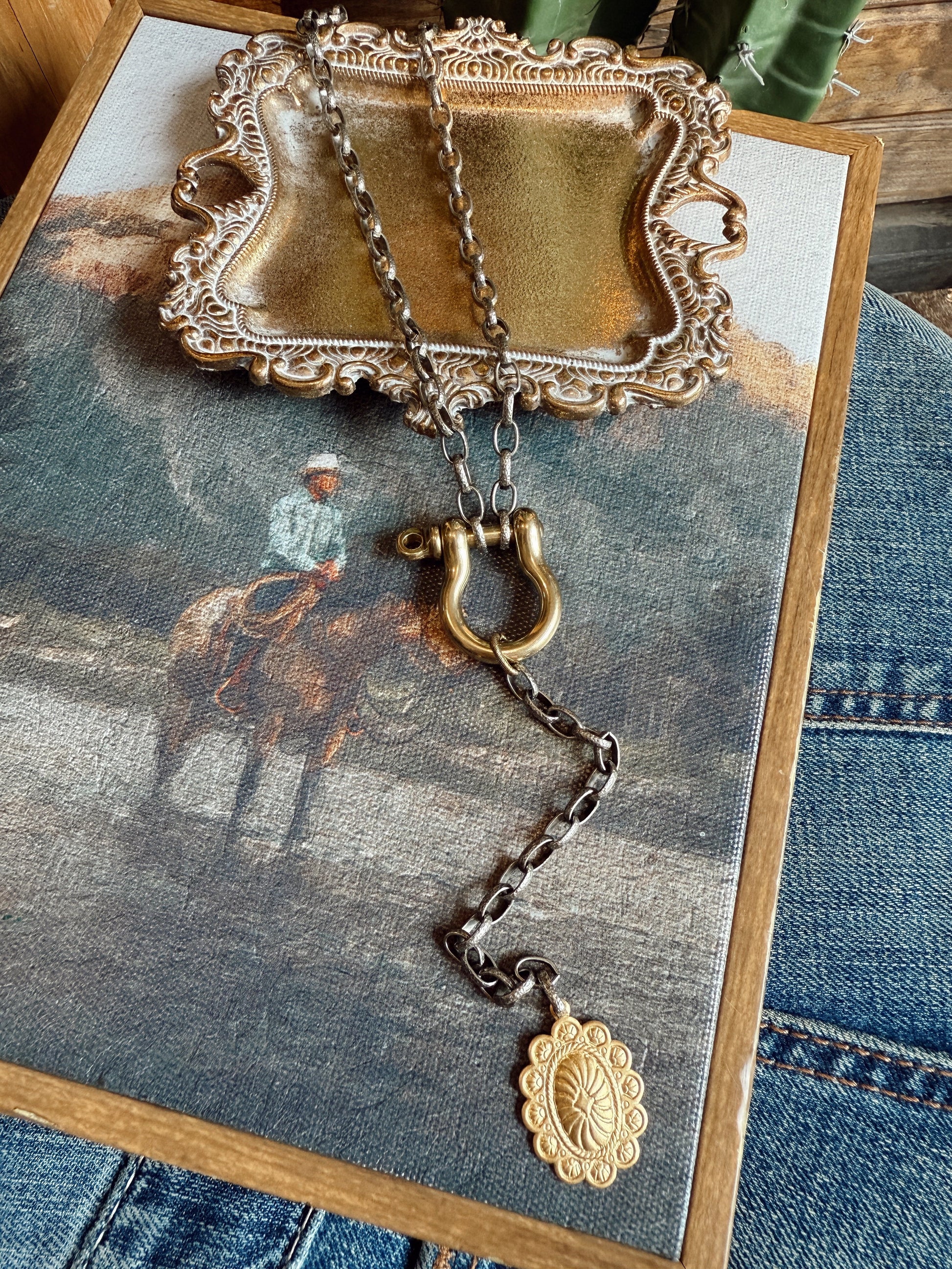 Designed and created by me, a rodeo wife in Texas, USA, this lariat features a textured paperclip chain in antique German silver — a rare material with a timeless western feel. Finished with a mixed-metal horseshoe pendant and concho charm, it pairs perfectly with the matching hand chain made from the same artisan materials. Most components are sourced from the USA, and my rodeo roots inspire every design. All materials are artisan and handmade, so slight variations add character. Normal jewelry care for plated pieces applies — avoid water, lotions, and perfumes to keep it looking its best.