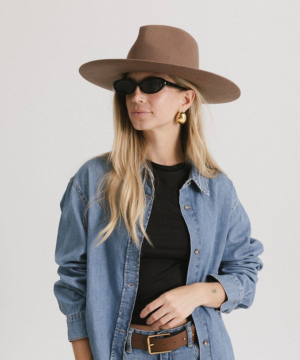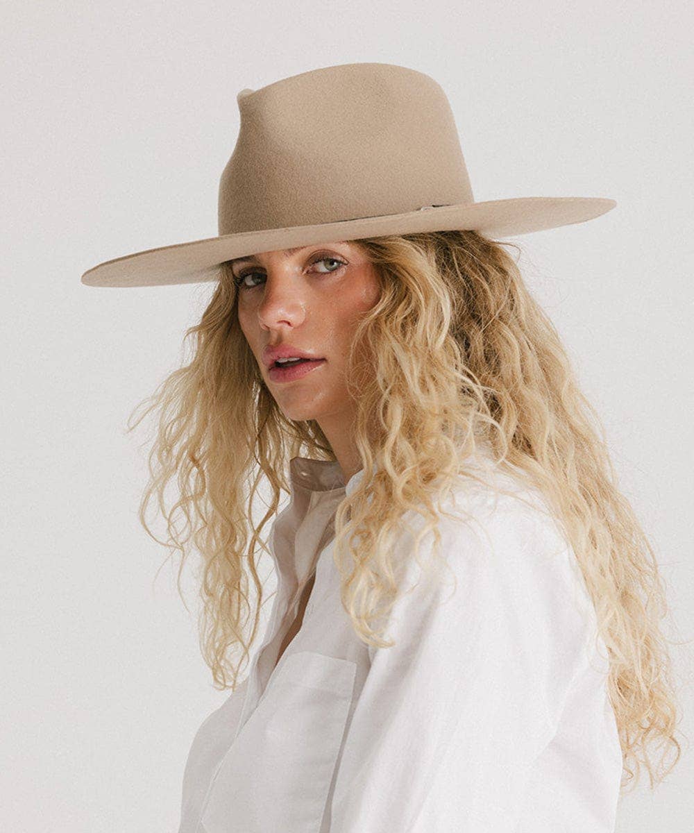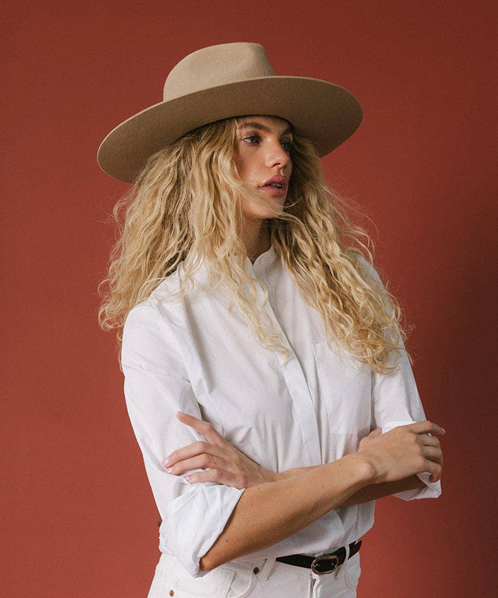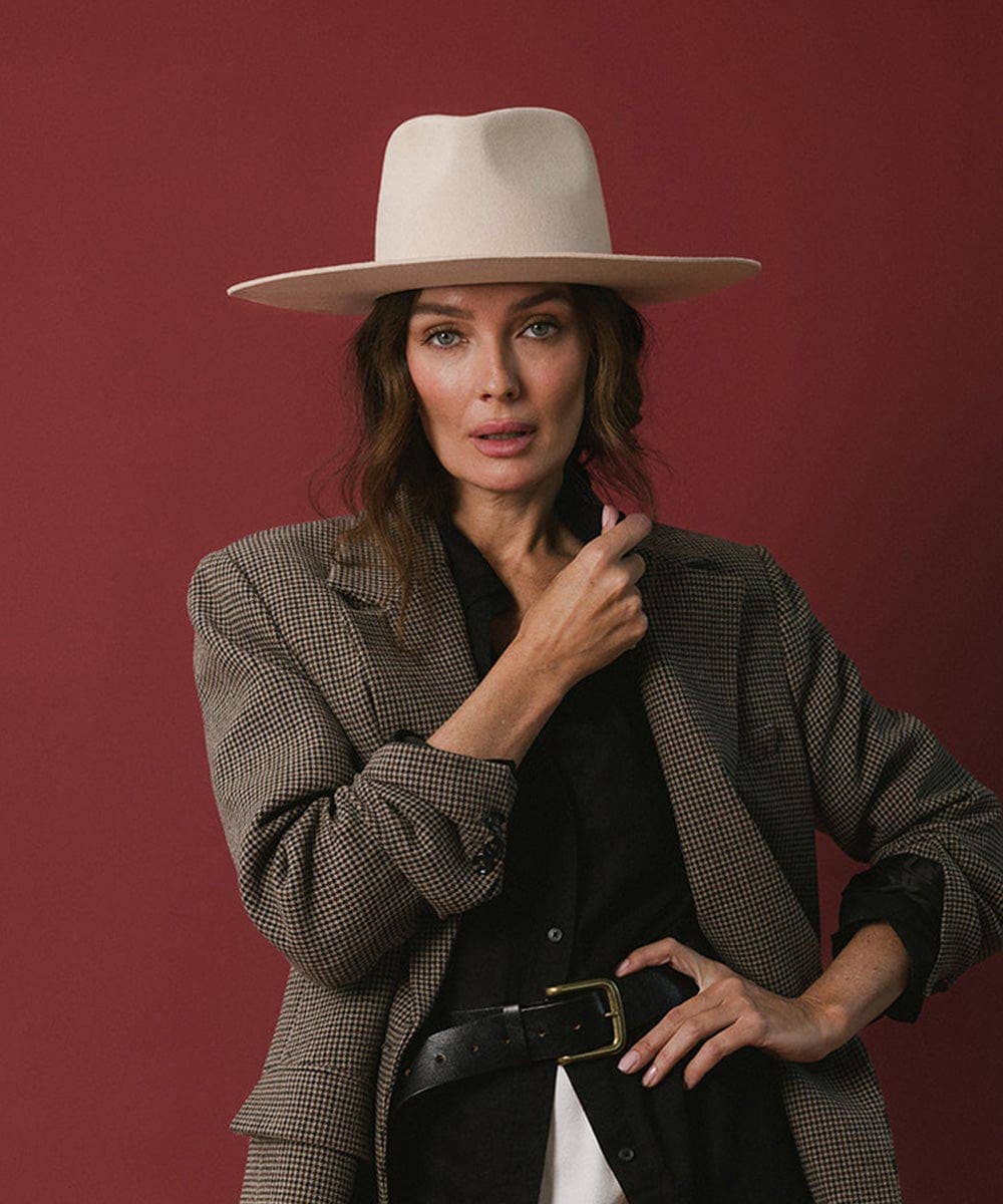 The Wesley is a great introduction to our Western collection + an easy way to infuse your everyday look with a bit of western flair. With her pinched fedora crown + wide, flat brim, the Wesley is a modern take on the traditional western hat.