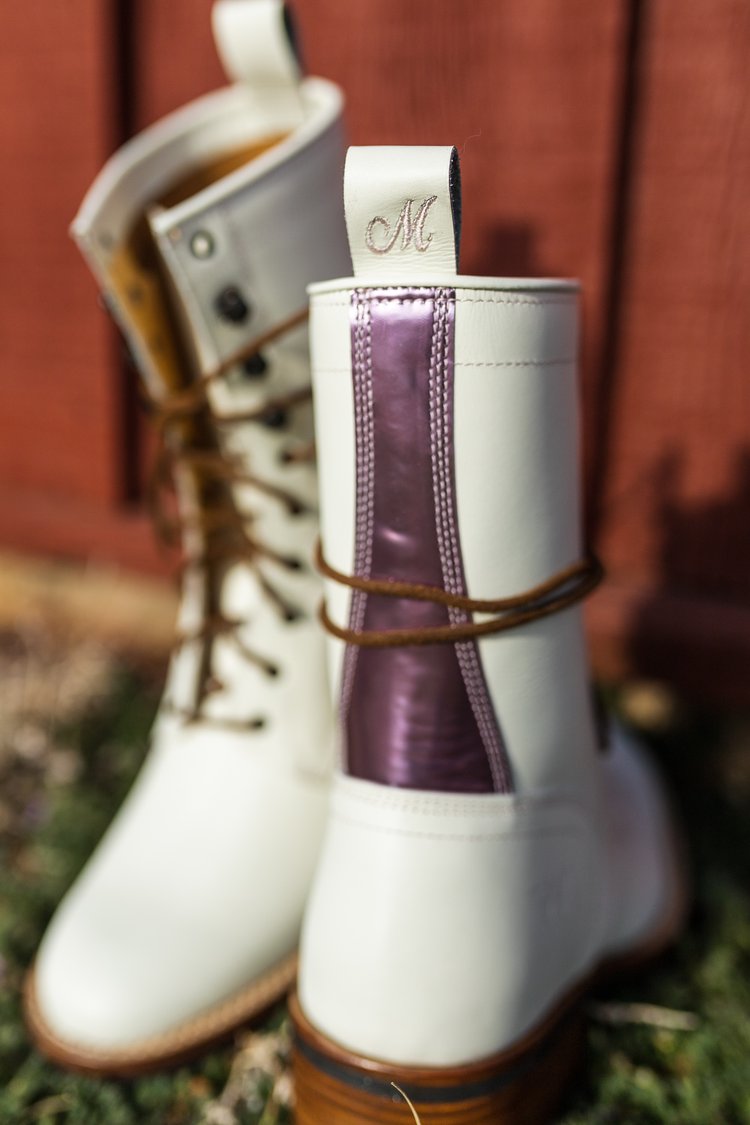 The Willa Boot is a tall lace up packer style boot that can be ordered in any color with any accent. This particular boot features pink stitching and accents as well as custom initials stitched on the pull.